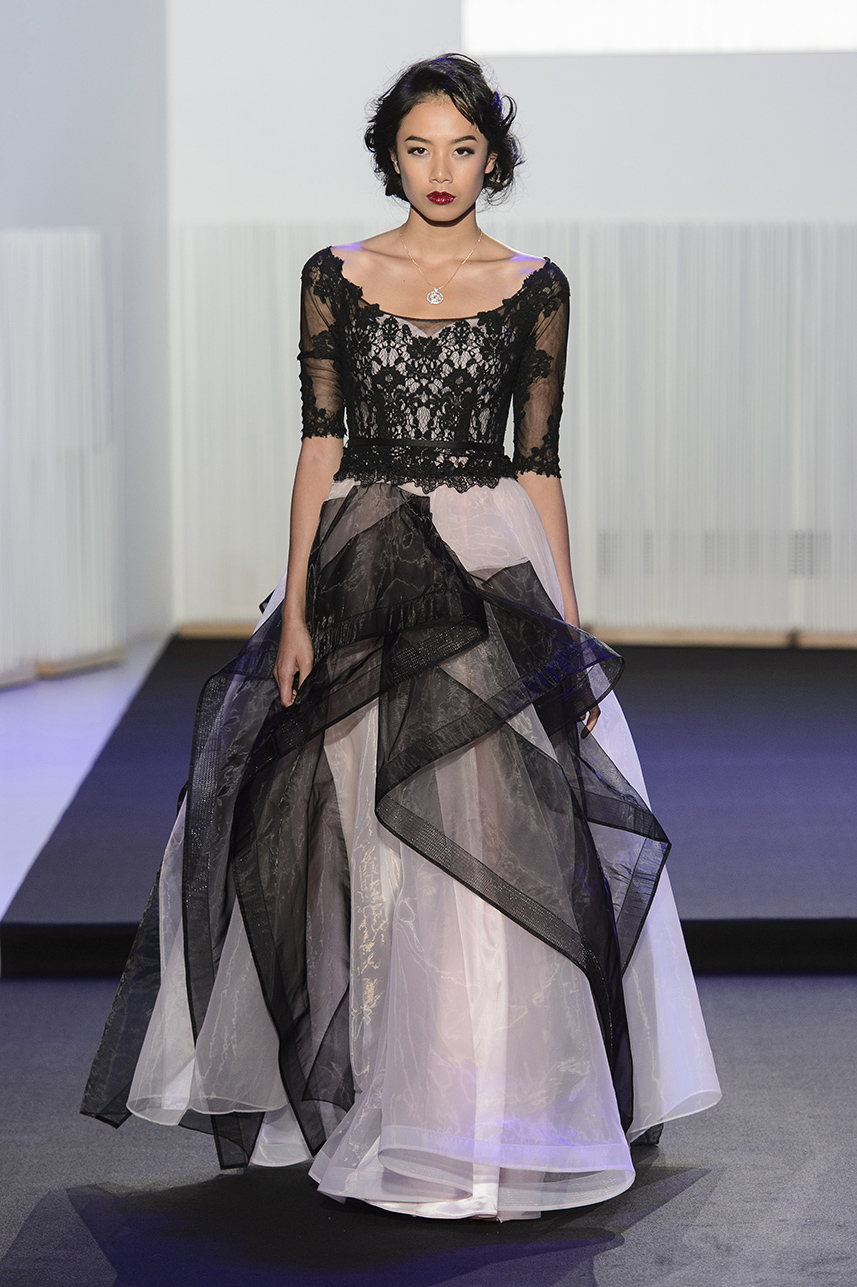 Look 17 - maxi robe a pans en organza nude et noir encolure bateau applique de dentelles - maxi dress with pieces in organza nude and black boat neckline applied with lace - Céline