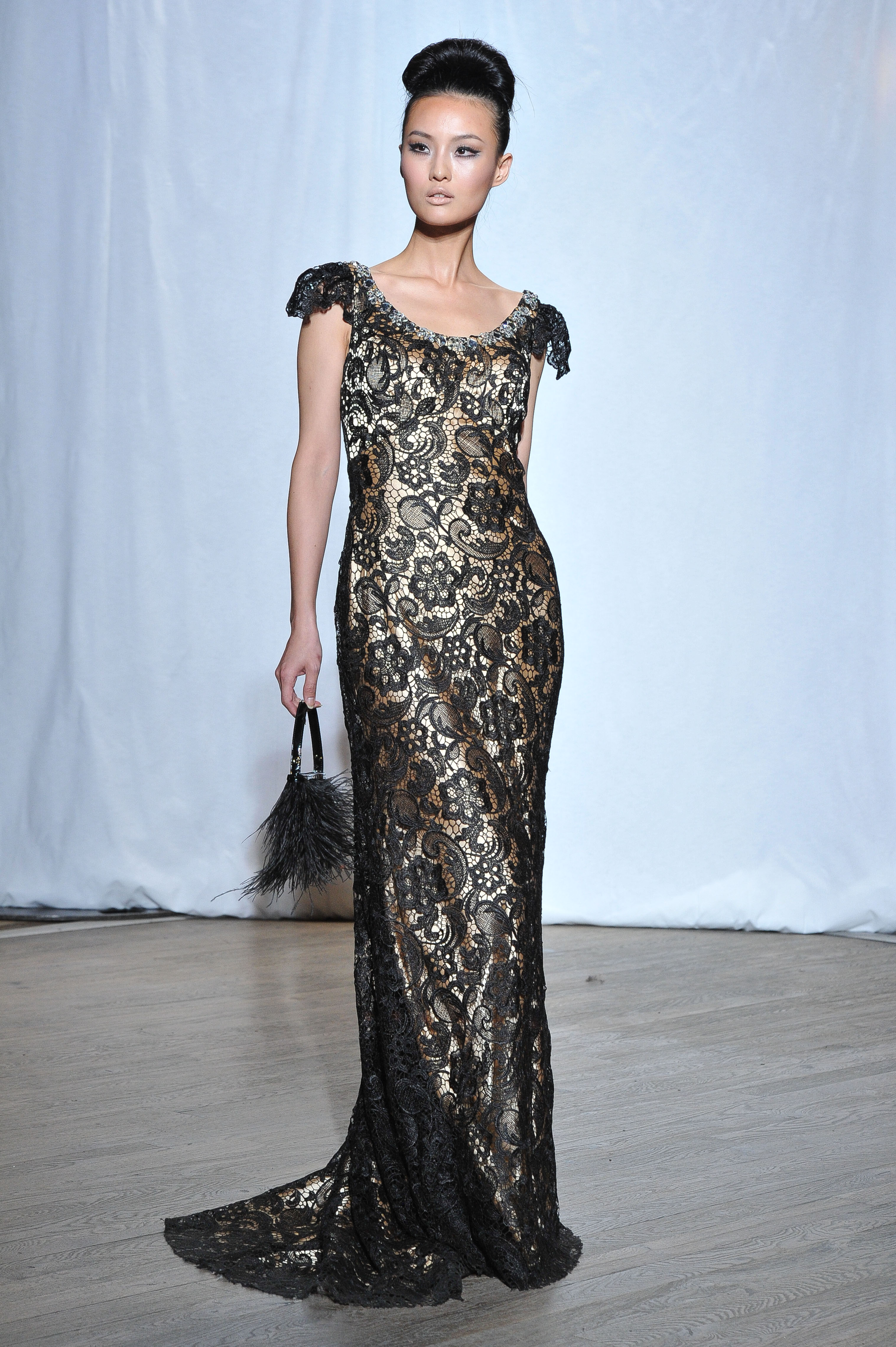 Fourreau en dentelle noir doublé de satin camel et souligné de pierreries à l encolure. Black lace gown lined with cognac satin and neckline outlined with crystal stones. Gia.