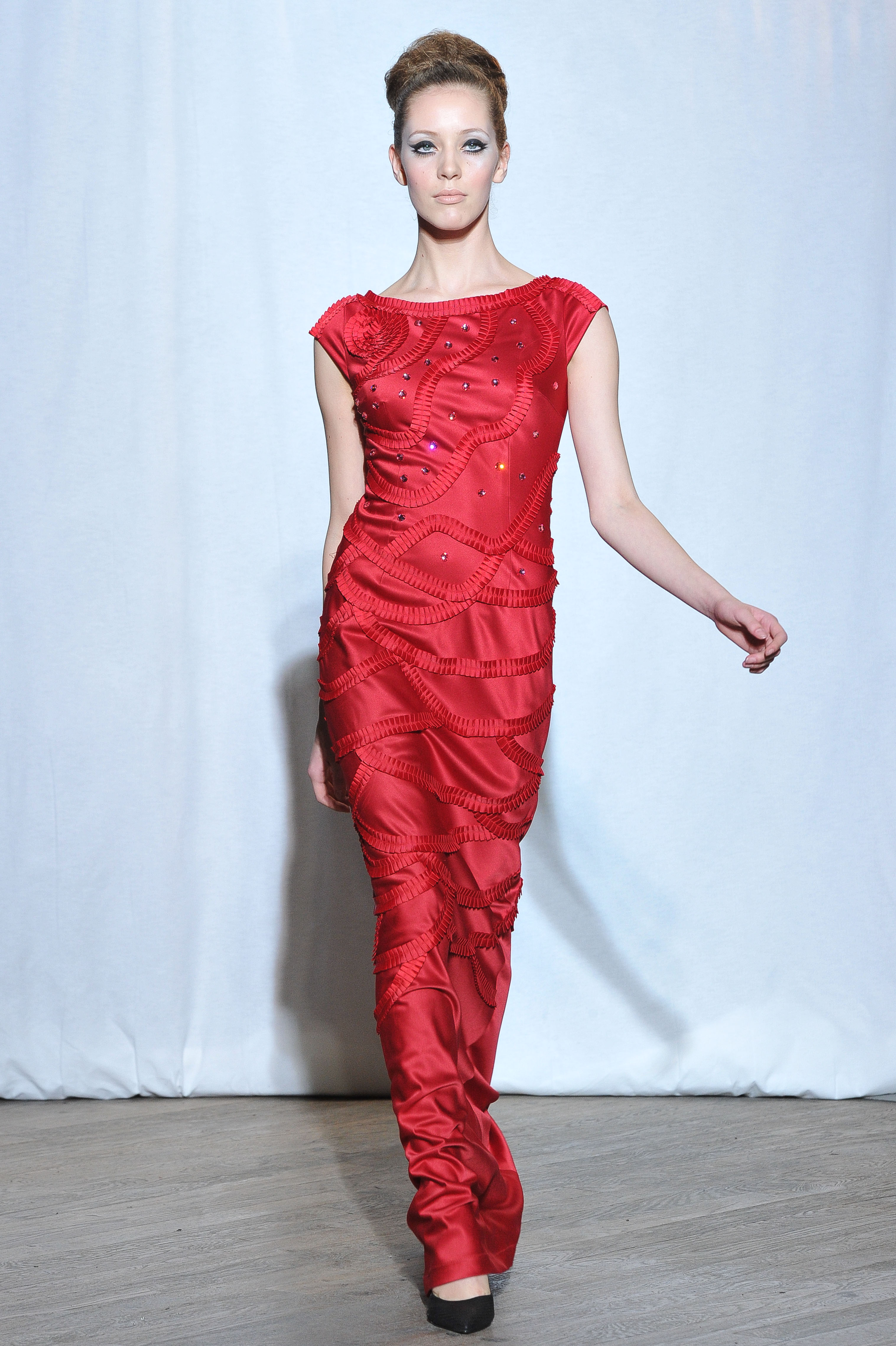 Fourreau en satin duchesse rouge appliqué de rubans plissés. Ruby red duchess satin closed neckline long dress applied with pleated ribbon. Ave.