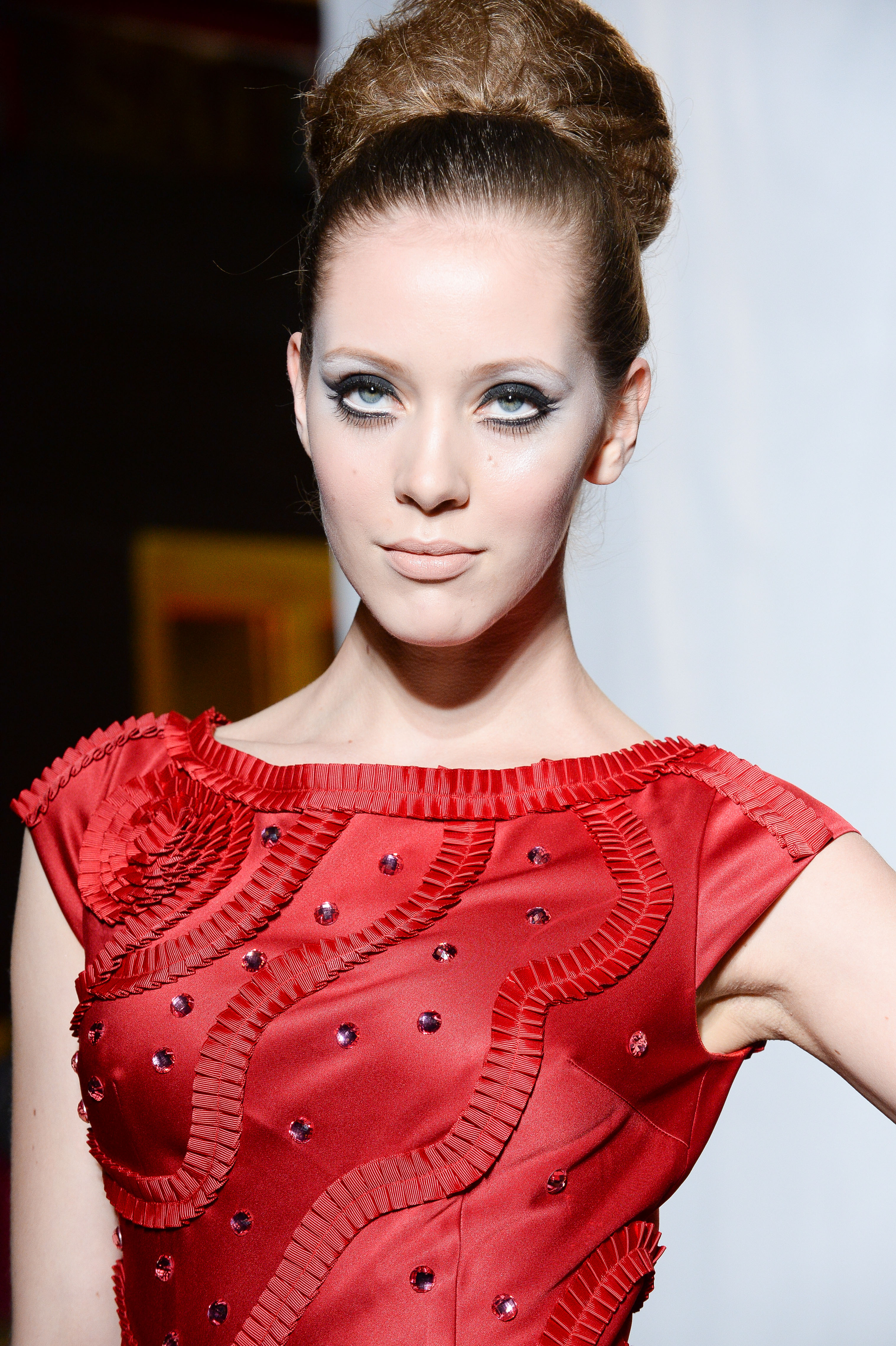 Fourreau en satin duchesse rouge appliqué de rubans plissés. Ruby red duchess satin closed neckline long dress applied with pleated ribbon. Ave.