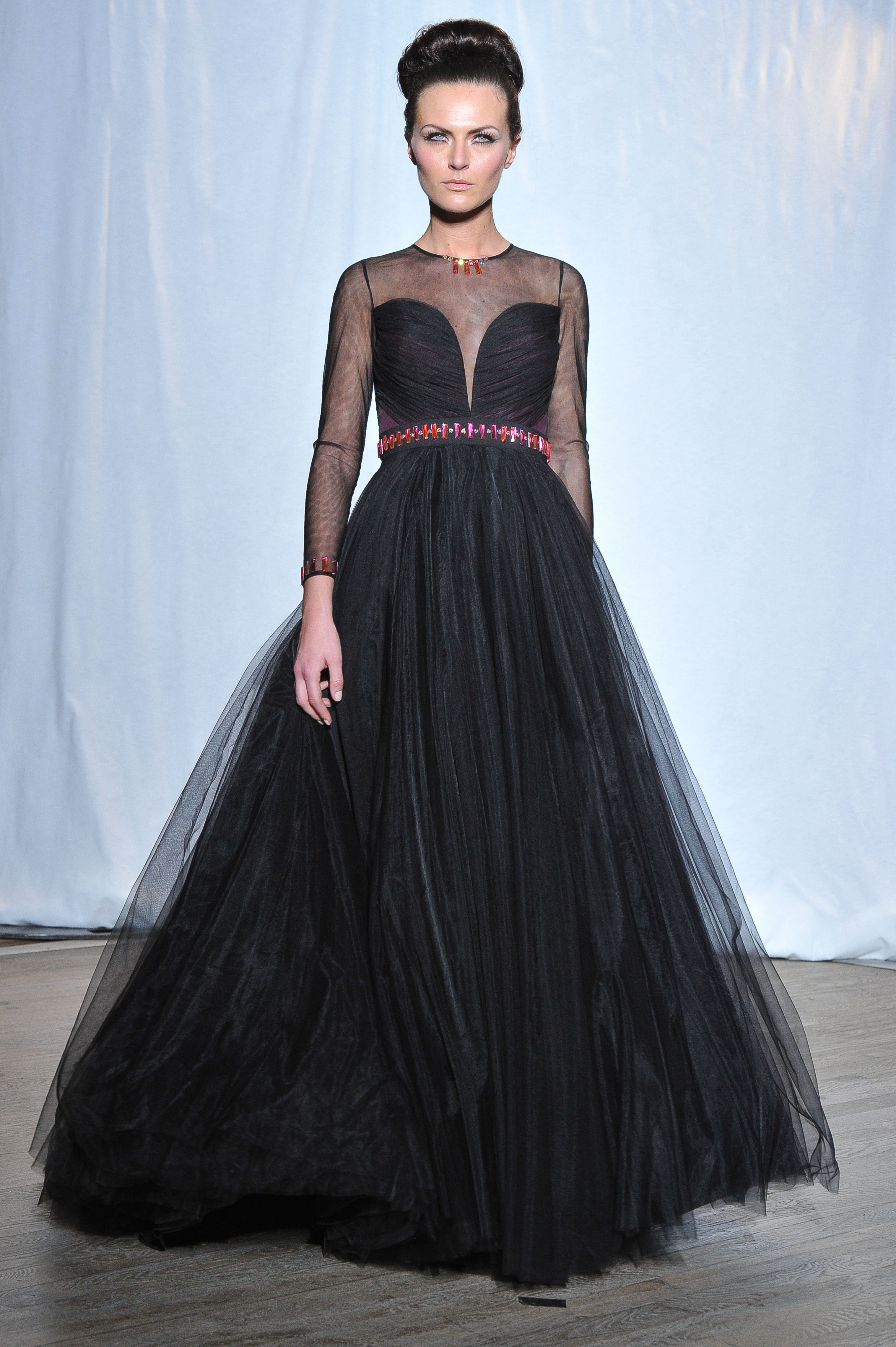 Maxi robe en tulle noir au buste fendu. Black maxi dress with sheer plunging neckline. Lucie.