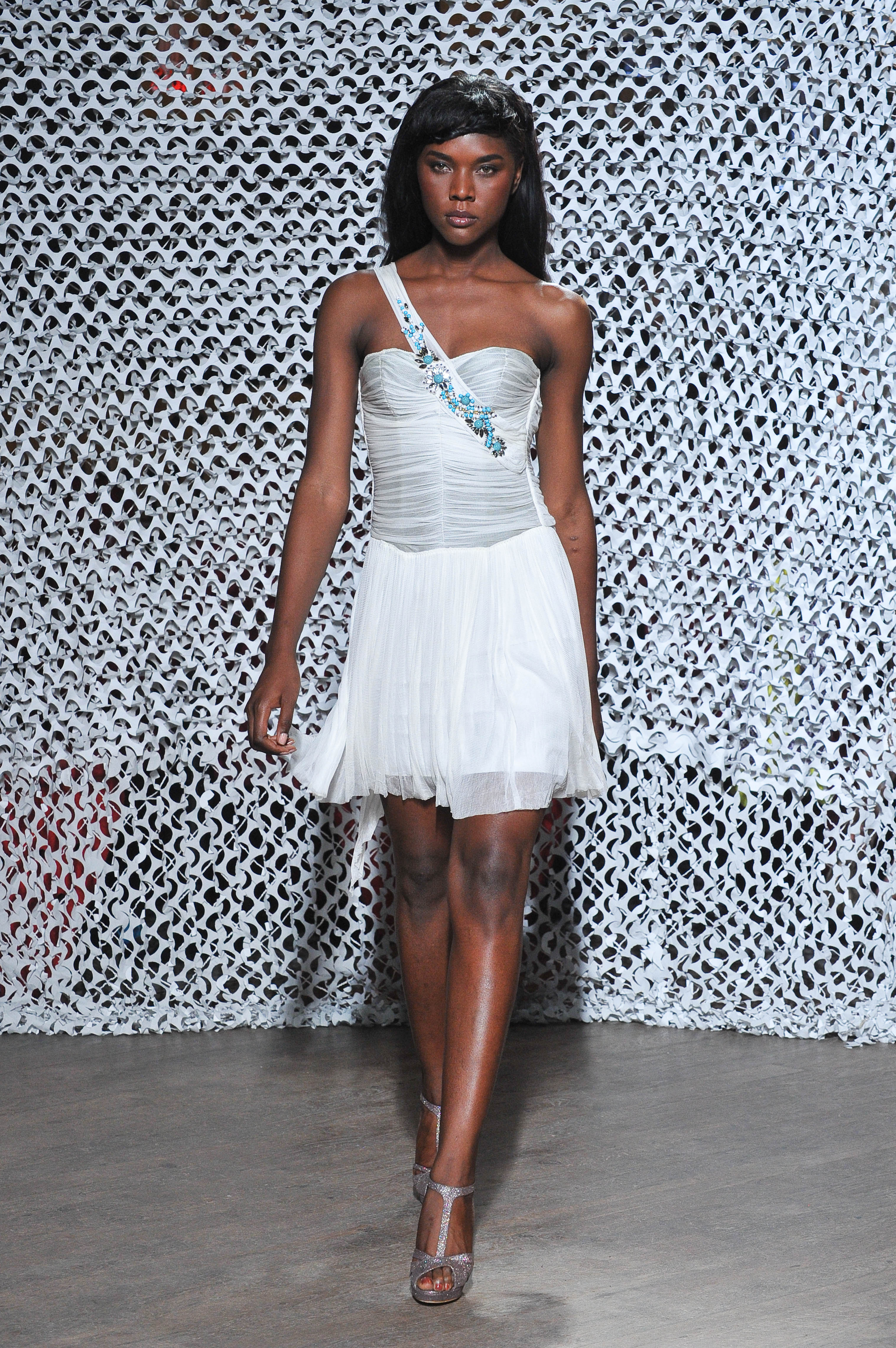 White silk tulle draped minidress embroidered with turquoise stones. Spring-Summer 2013 fashion show «Muse» - Christophe Guillarme Paris - Tuesday September 25th, 2012 at Balajo - Paris Fashion Week