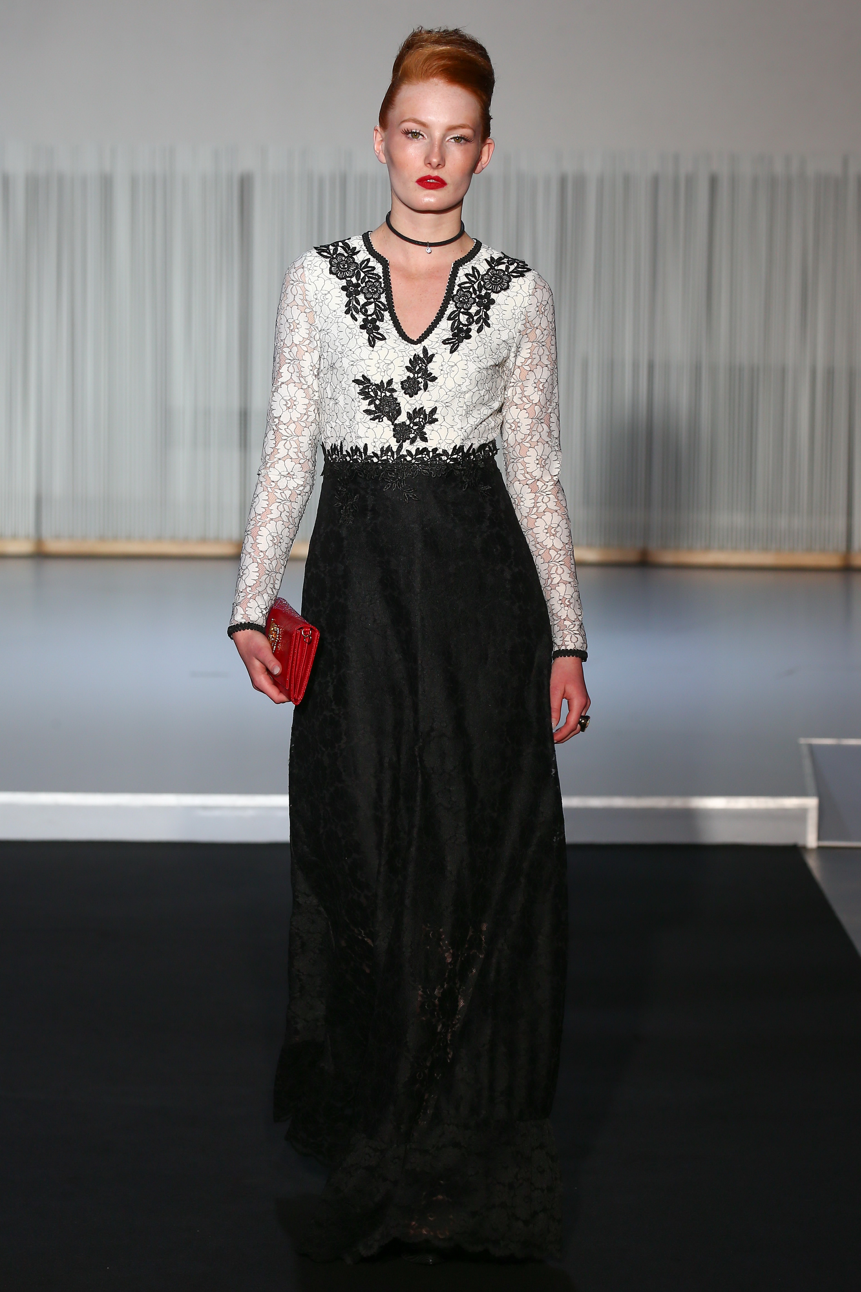 look 10 - robe longue noire et blanche en dentelle appliquee - black & white geometric printed maxi dress in Mikado silk with black mesh sleeves - Robin