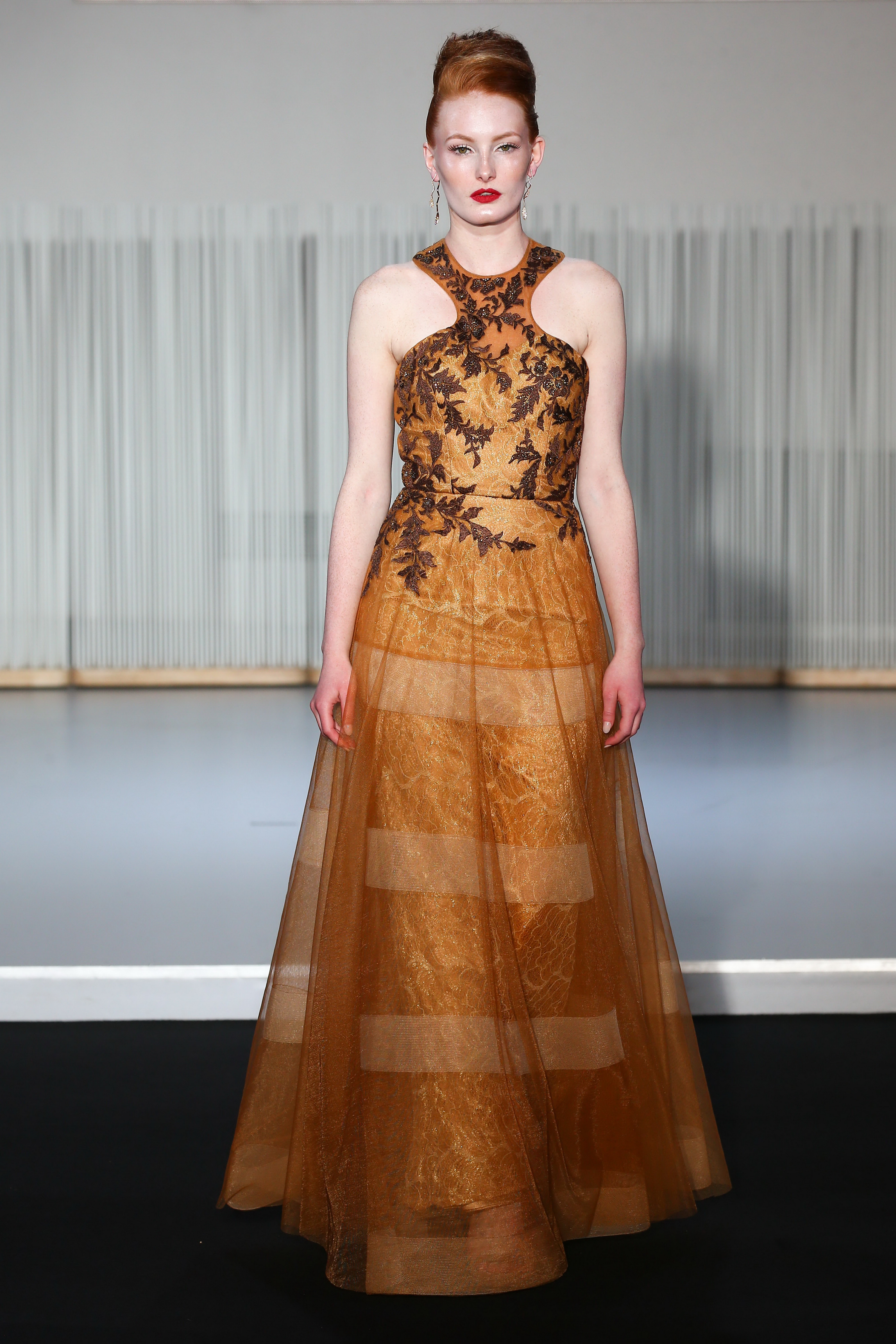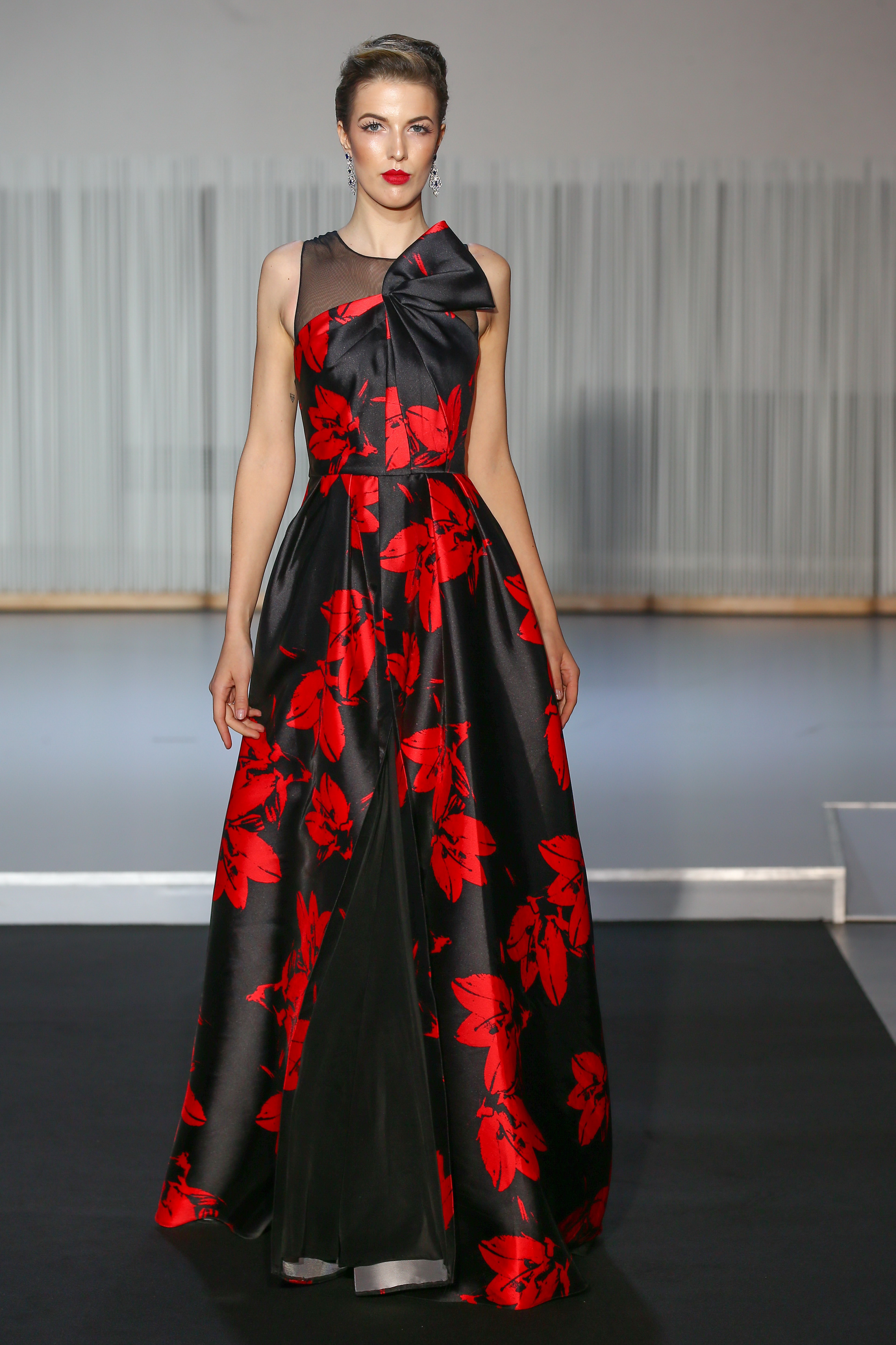 This two tone story is reflecting bel canto and resonant research, mixed of virtuosity and uses of ornaments, nuances and vocalizations to reach a wide open harmony. Lyric goddess is playing alternaly Violetta in purple mikado silk off the shoulders maxi dress, or Carmen in a scarlet flowery printed and slitted gown.