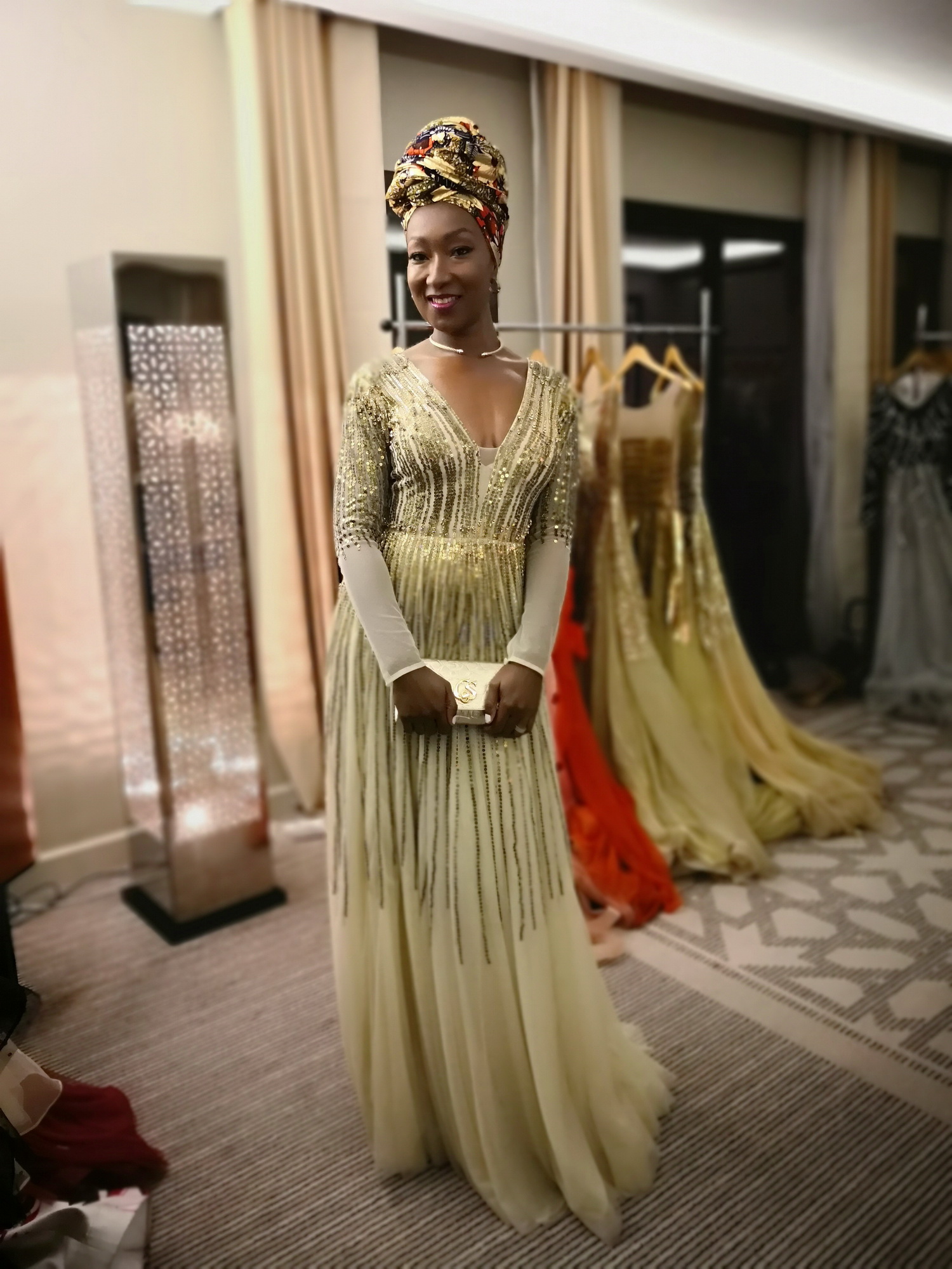 Dressing Christophe Guillarme - Movenpick Marrakech - Nadege Beausson Diagne - robe longue Christophe Guillarme a manches en tulle nude rebrodee de lignes depaillettes et cristaux - boucles d oreilles et tour de cou Charriol - pochette Carmen Steffens