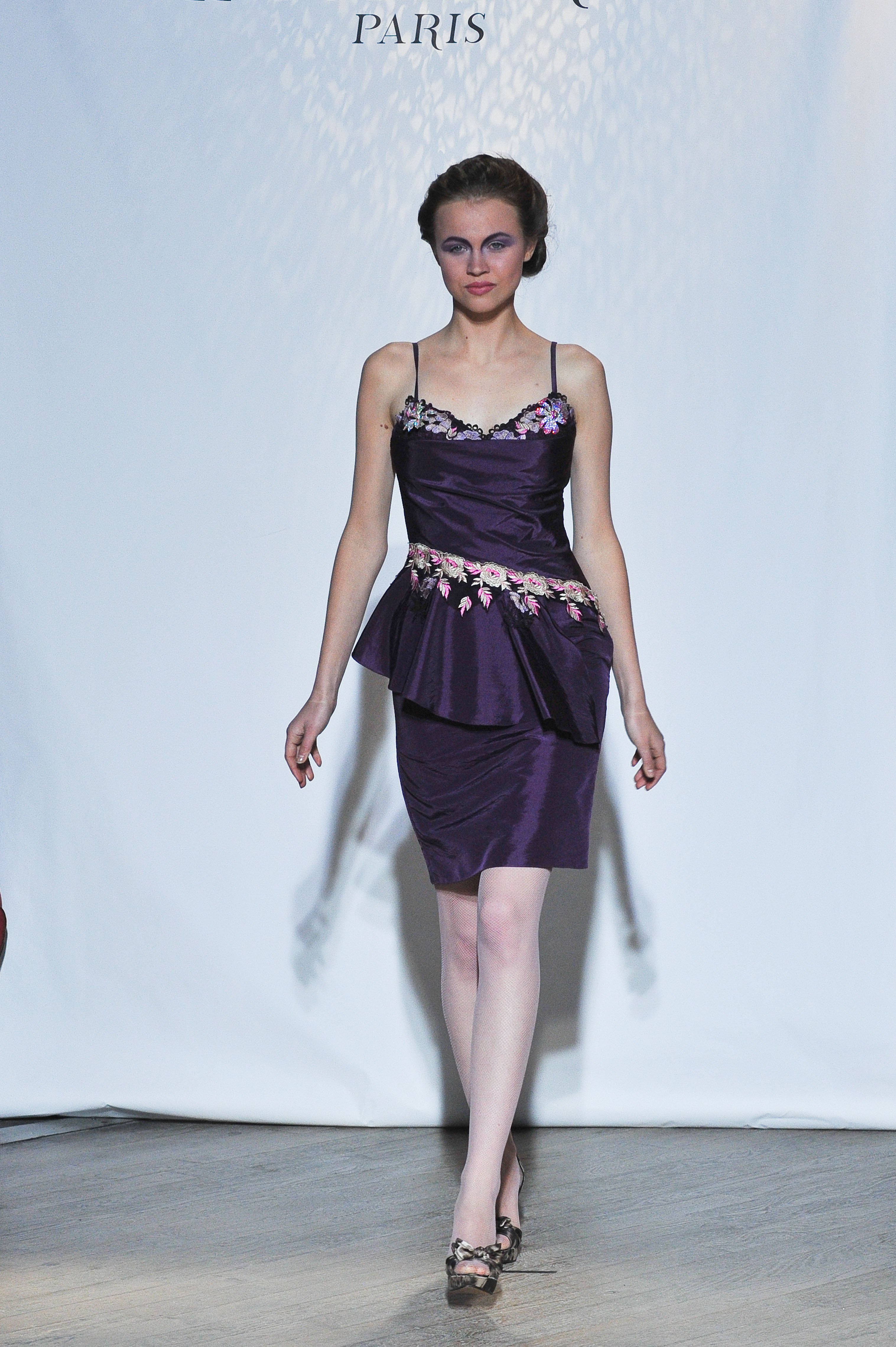 Fall-Winter 2013-2014 fashion show «Boheme» - Christophe Guillarme Paris - Tuesday February 26th 2013 at Balajo - Paris Fashion Week - Robe courte en taffetas prune brodé de guipure - Prune taffeta short dress embroidered with guipure . Roberta