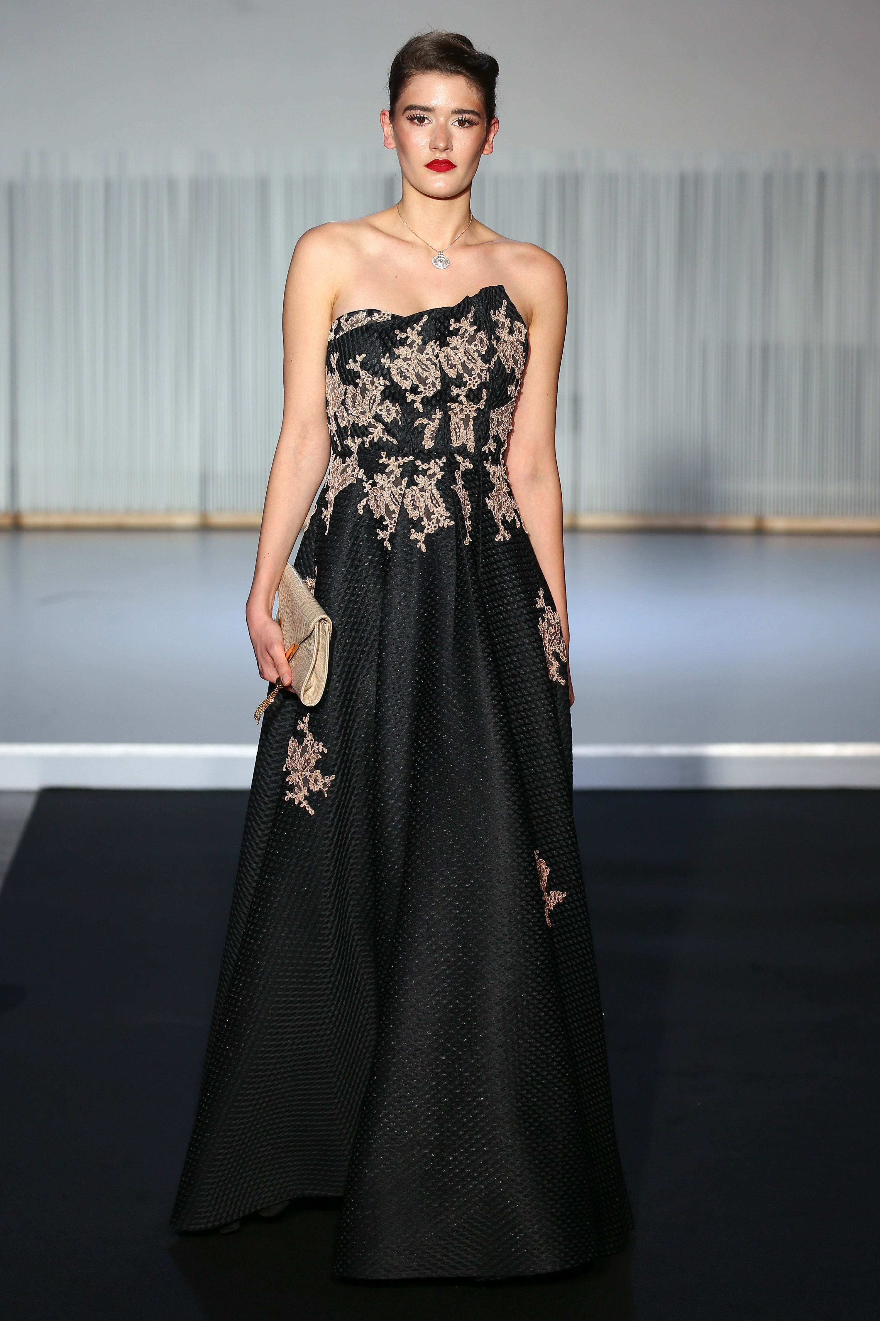 look 20 - maxi robe bustier en resille technique applique de dentelle champagne - black technical mesh bustier long dress applique with golden lace - Ksenia