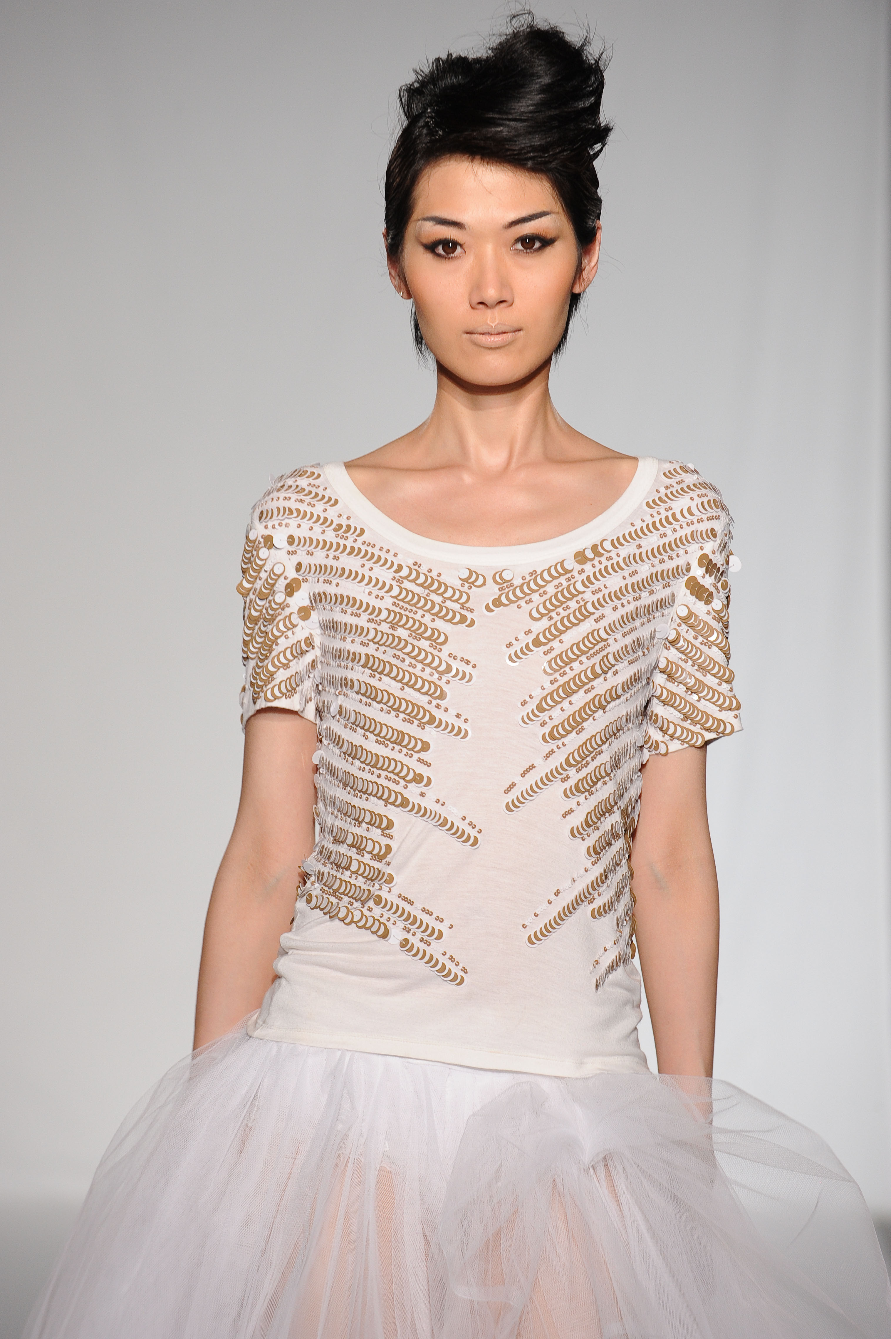 Tee-shirt en coton blanc rebrodé de lignes de sequins blanc et or. White cotton tee-shirt embroidered with white and gold lines of sequins. Carrie