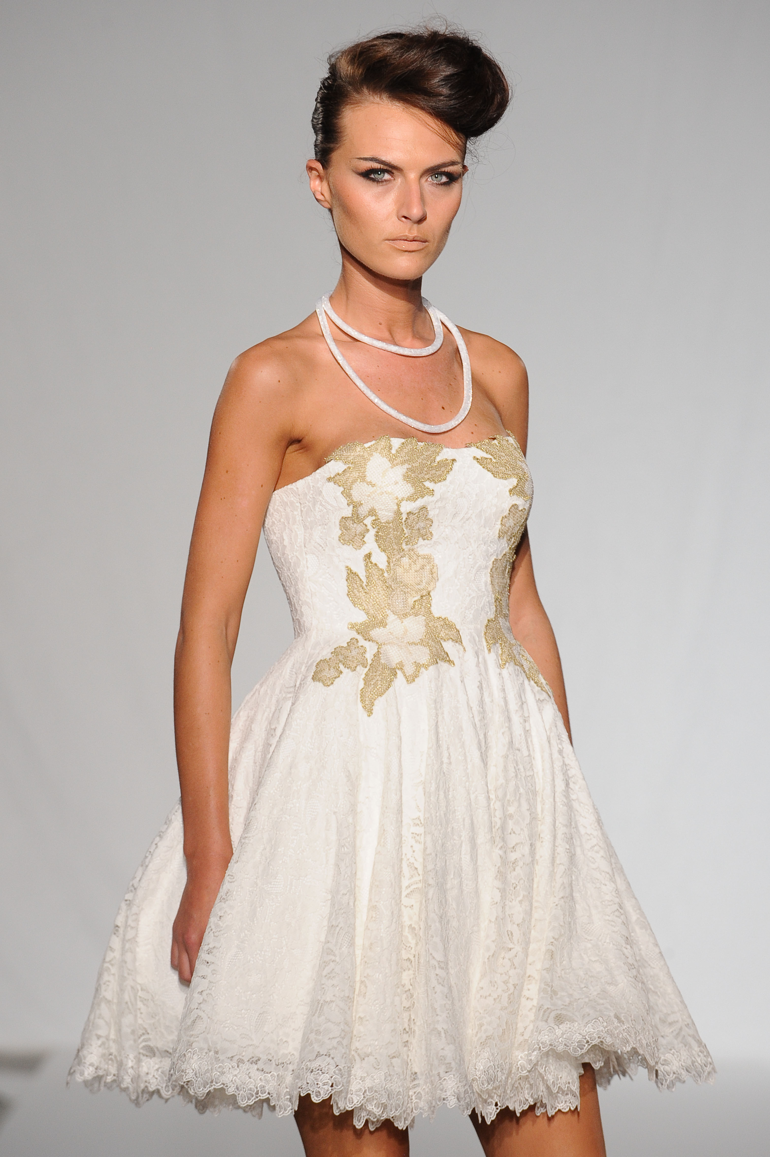 Mini robe en dentelle blanche à jupe évasée appliquée de motifs au point de croix. White lace A line mini bustier dress applique with cross stitch. Lucie