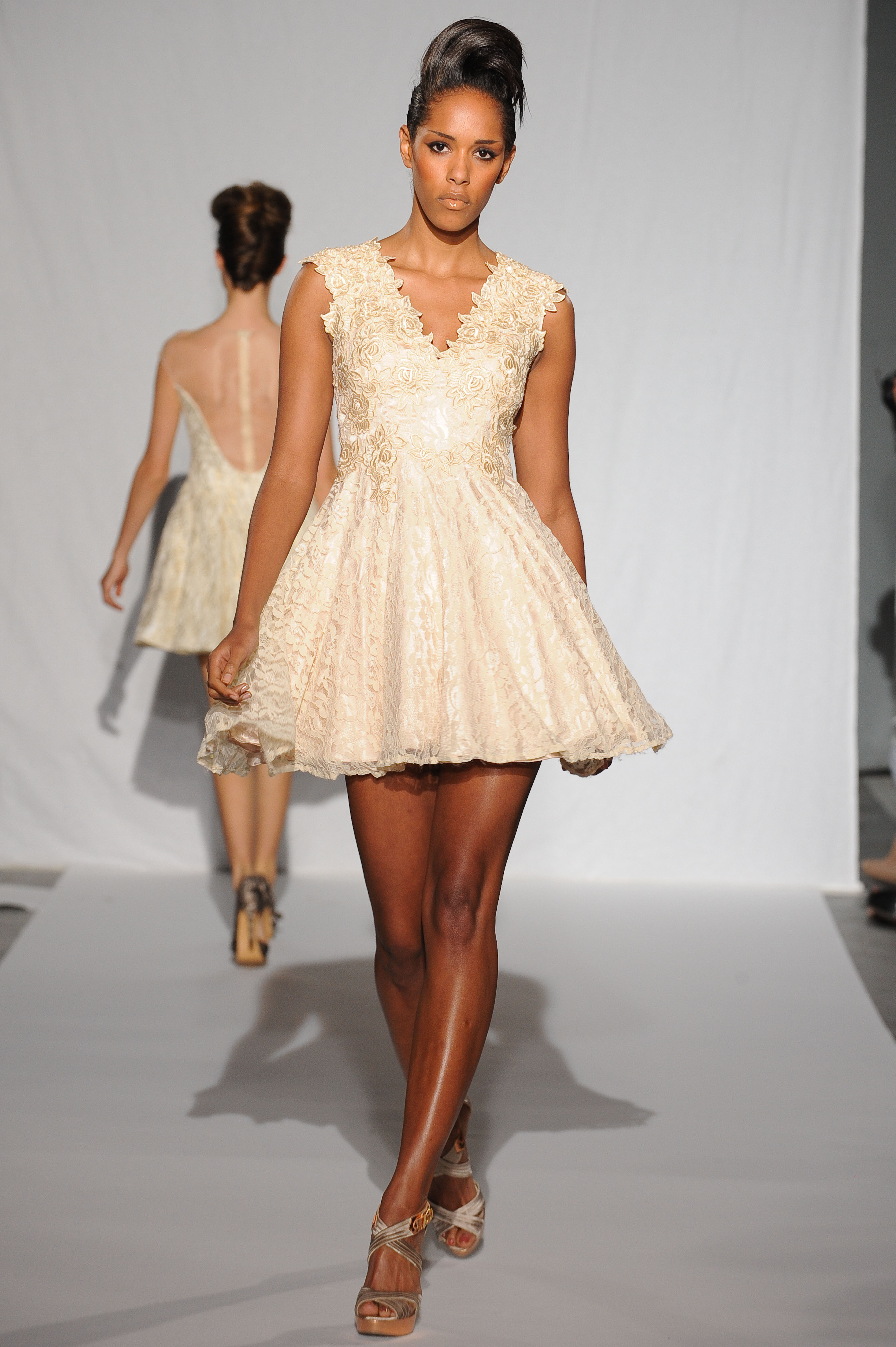 Mini robe à jupe évasée en dentelle beige appliquée de guipure rebrodée ton sur ton. Beige lace A line mini dress applique with guipure tone on tone. Mandy