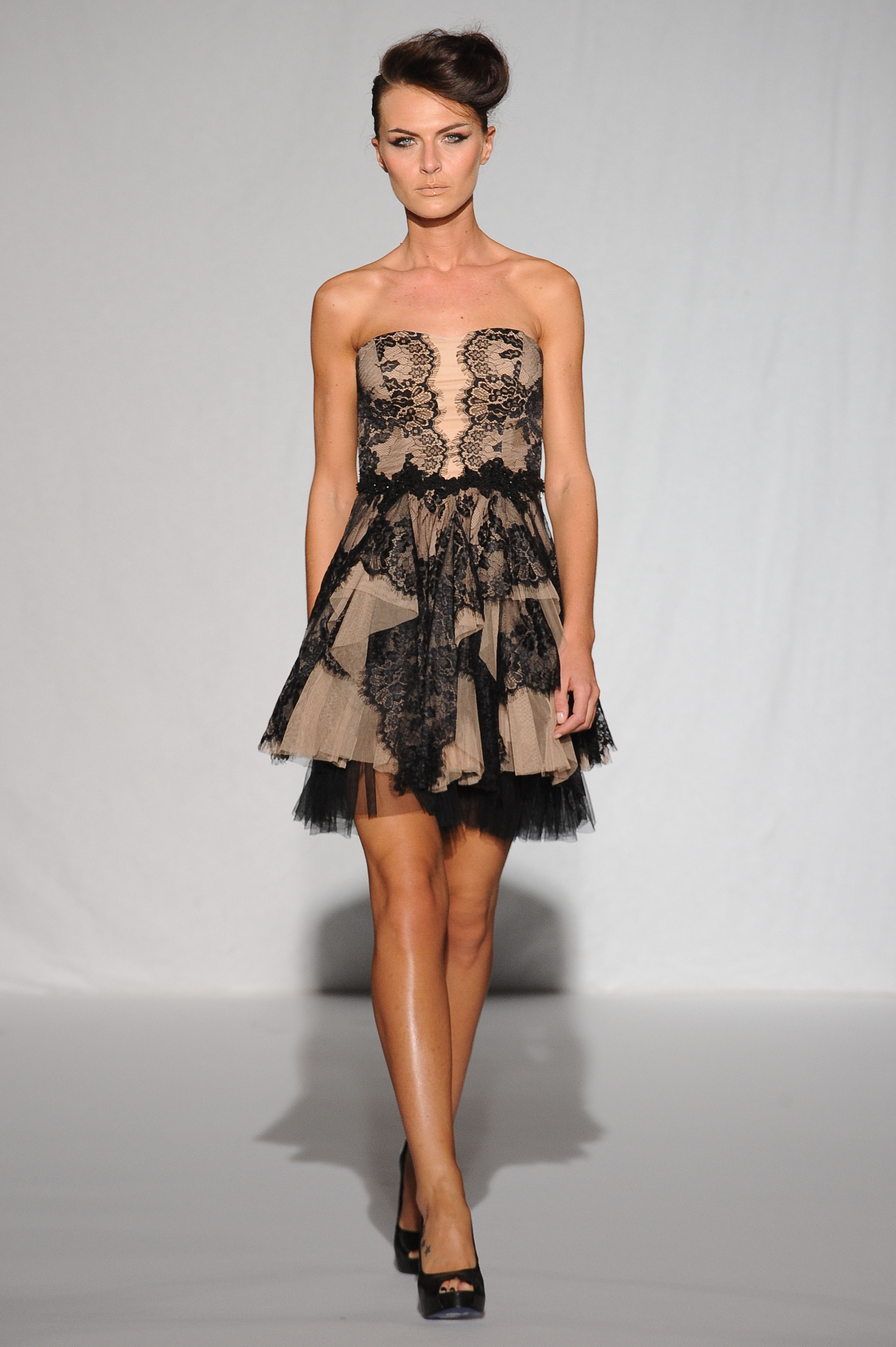 Mini robe bustier nude appliquée de dentelle noire et volants en tulle nude et dentelle. Nude mini bustier dress applied with black lace and frills in nude tulle and lace. Lucie