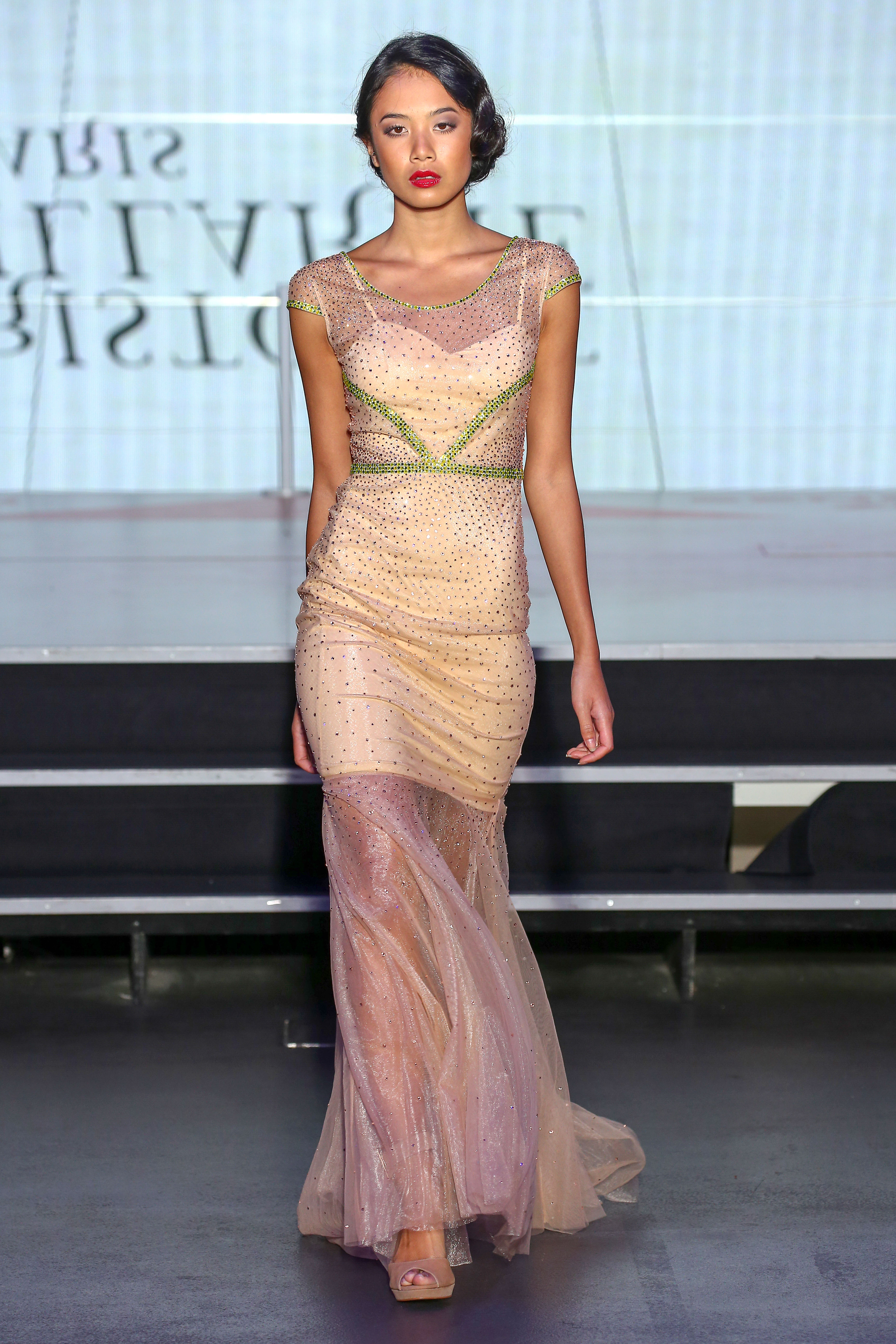 fourreau en tulle nude recouvert de cristaux peche et de lignes de cristal. nude tulle gown covered with peach rhinestones and crystal. Celine