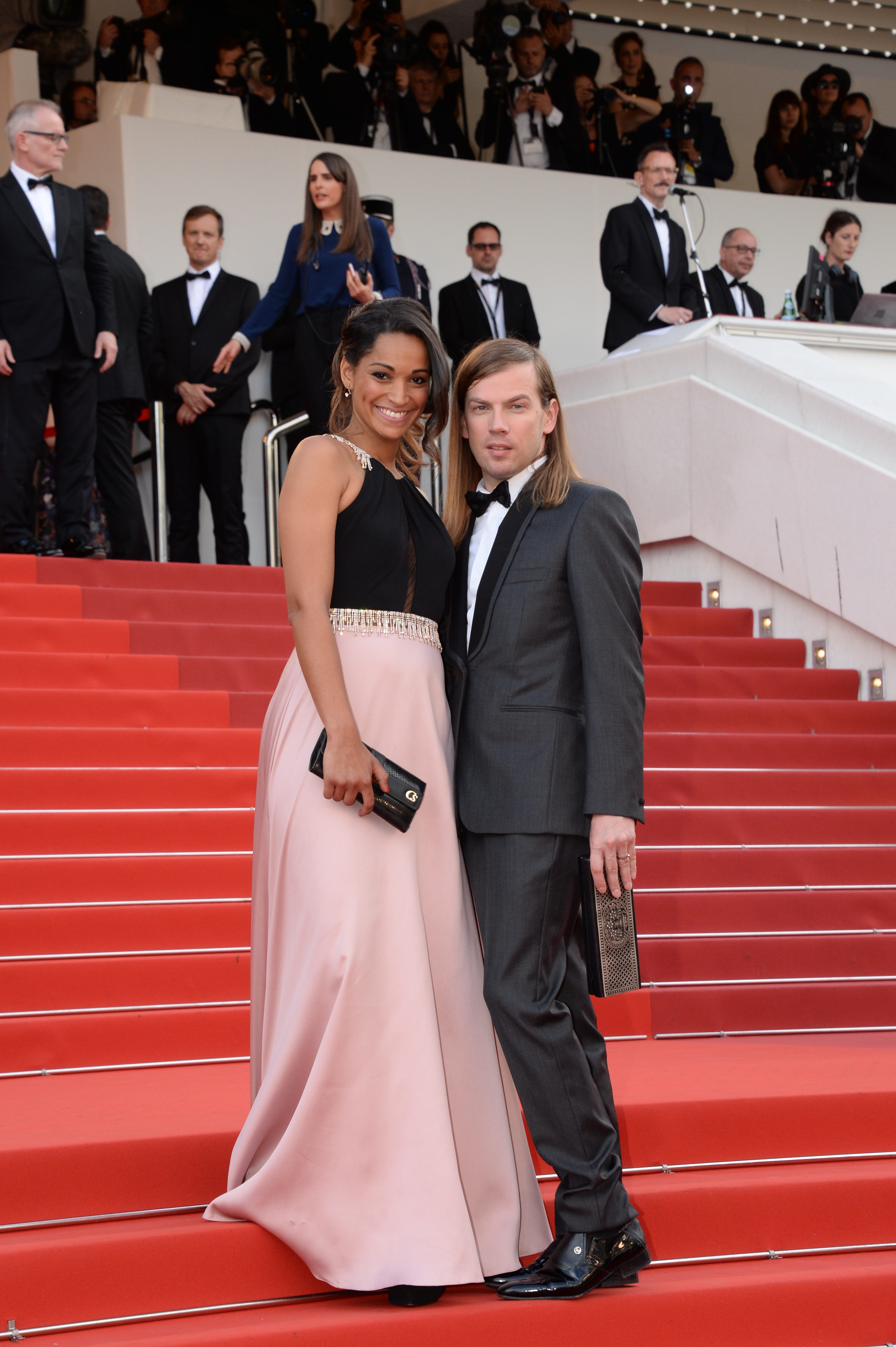 70e Festival de Cannes - Dressing Christophe Guillarme - tapis rouge - montee des marches pour la projection du film The Killing Of A Sacred Deer de Yorgos Lanthimos - jour 06 - Lundi 22 mai - 19h30 - Cindy Fabre, Miss France, dans une logue robe Christophe Guillarme en satin de soie rose poudre et buste en jersey noir, bijoux Elsa Lee Paris, pochette et escarpins Carmen Steffens, coiffee par Eros Giuliani et maquillee par Make Up For Ever