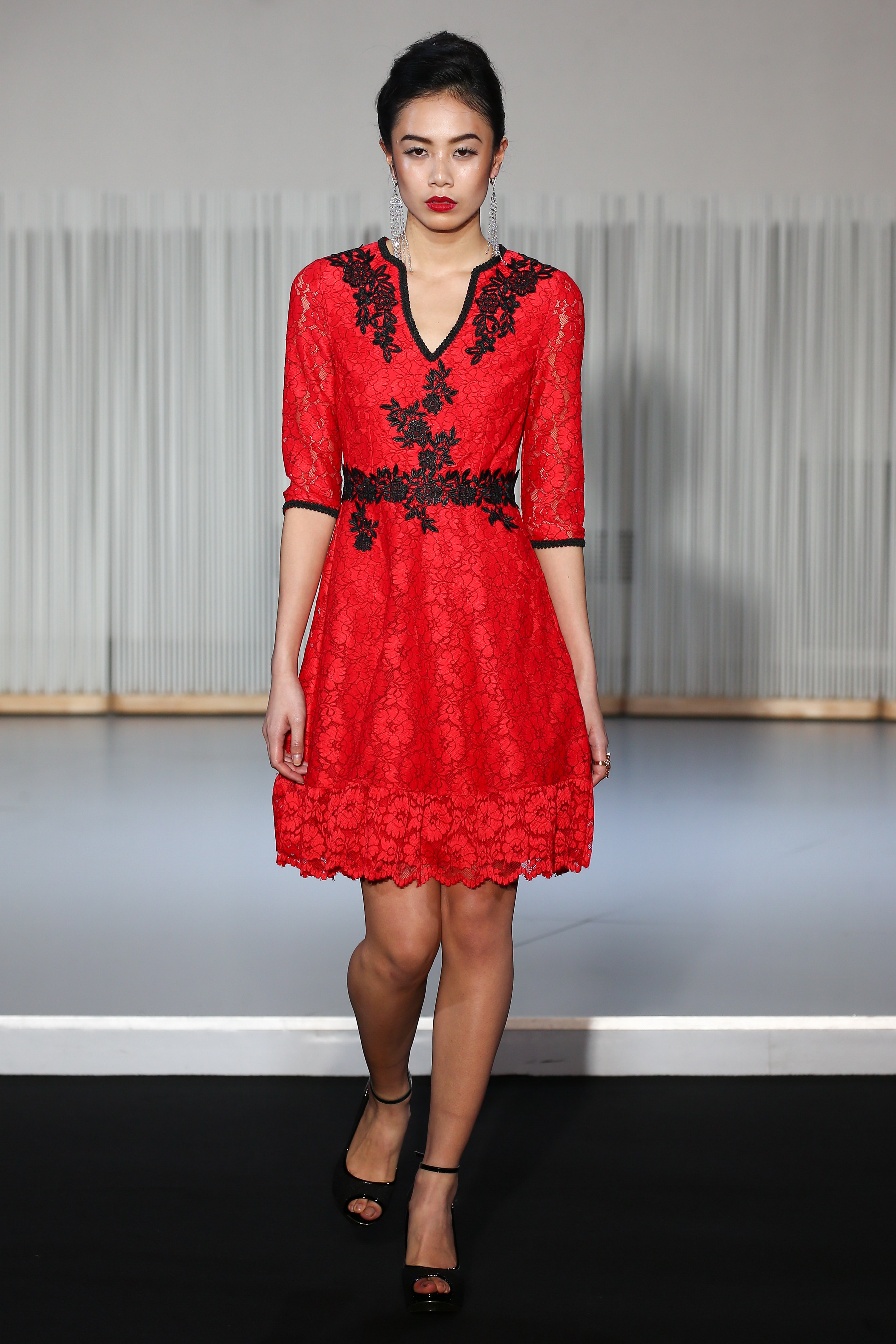look 12 - mini robe rouge en dentelle appliquee - red applied lace mini dress - Celine