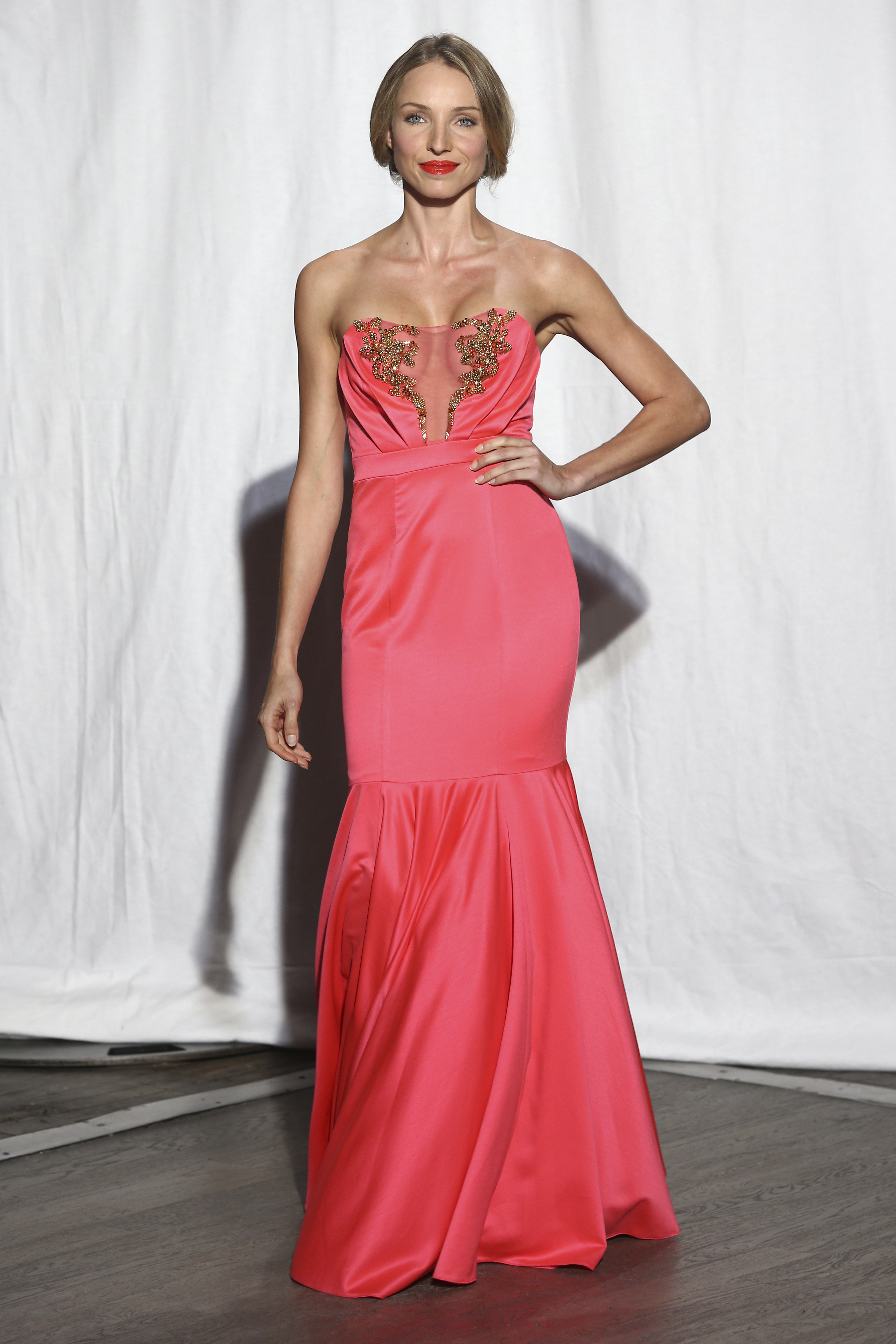 Robe bustier sirene en crêpe satin rose neon dont le decollete en tulle est souligne de pierreries. Neon pink strapless mermaid dress with sheer mesh cleavage outlined with beading. Olivia -