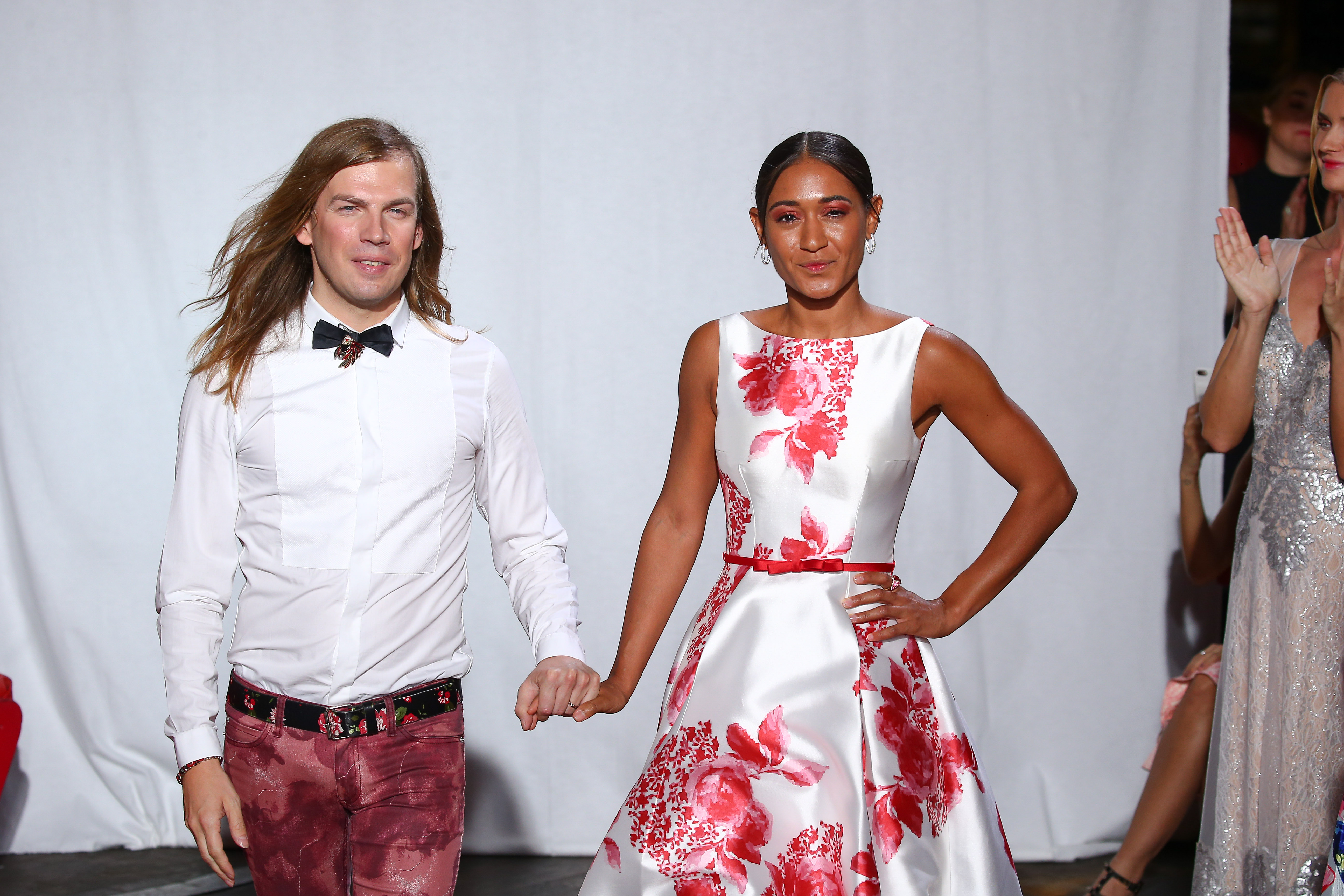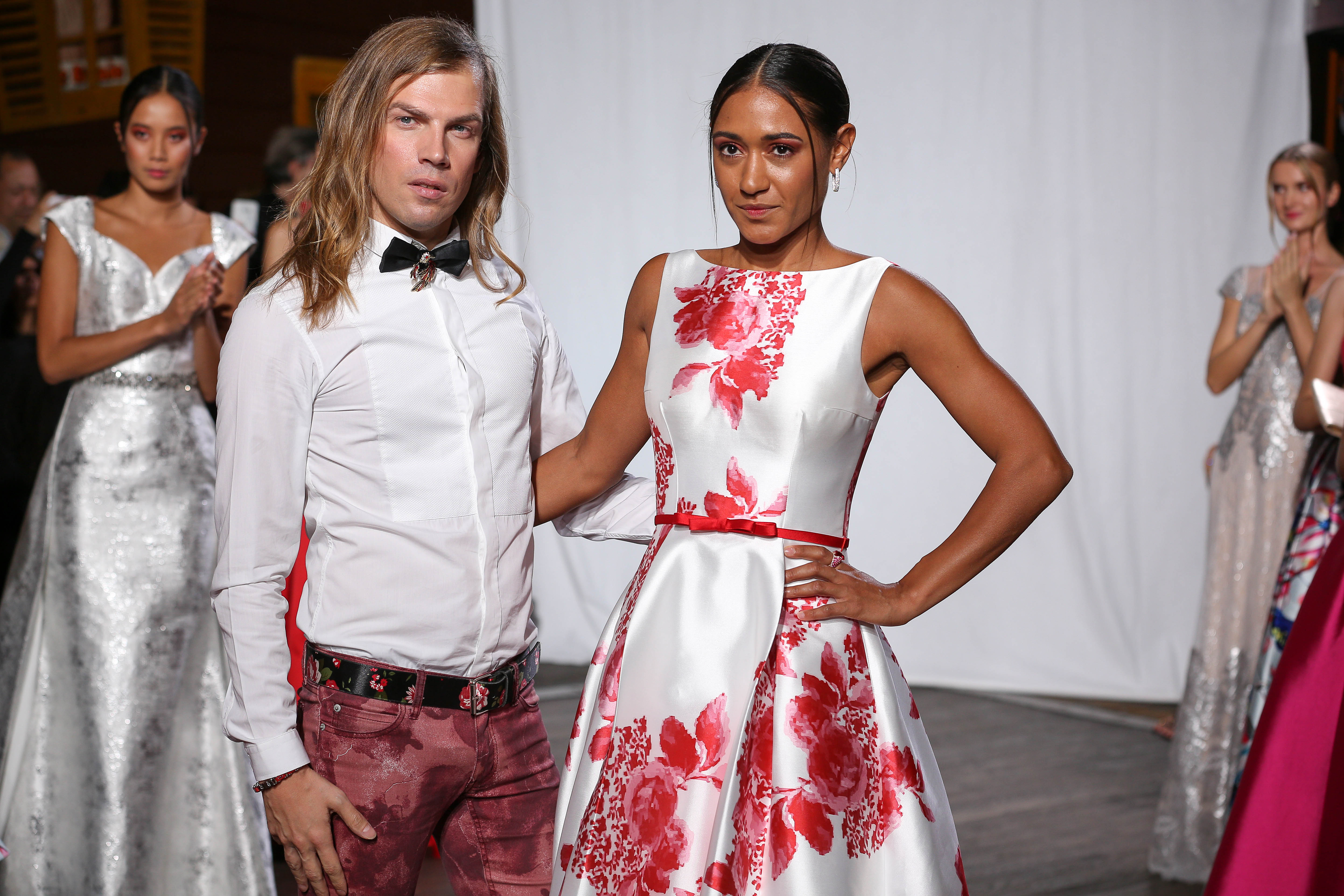 Tandis que la madone dévoile des dentelles blanches plissées et des imprimés fleuris, son double dans le miroir joue le glamour rétro version traîne en broché argenté, ou en maxi robe en faille de soie. Silhouette de sirène éthérée en tulle bouillonné ou mélange de noir et blanc enivrent et distillent une nouvelle écriture sur le fil du rasoir du fatal fourreau.