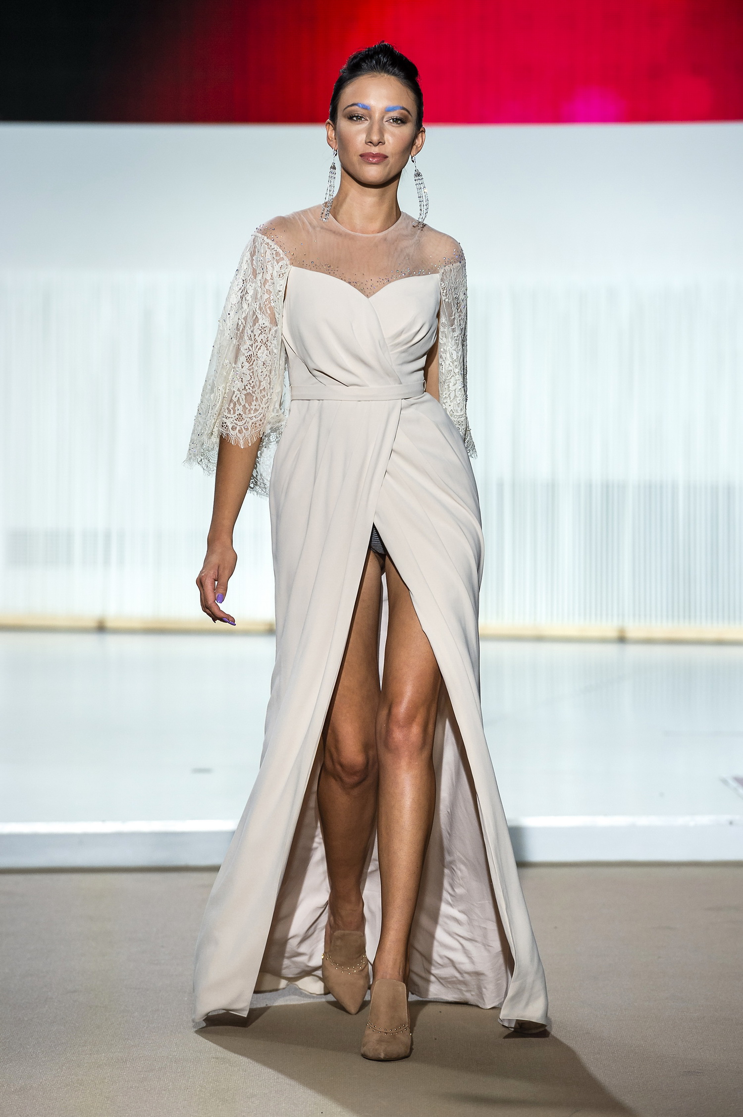 look 19 - fourreau fendu en crepe beige nude avec cape en dentelle integree - beige stretch crepe gown with slit and lace cape - Delphine Wespiser