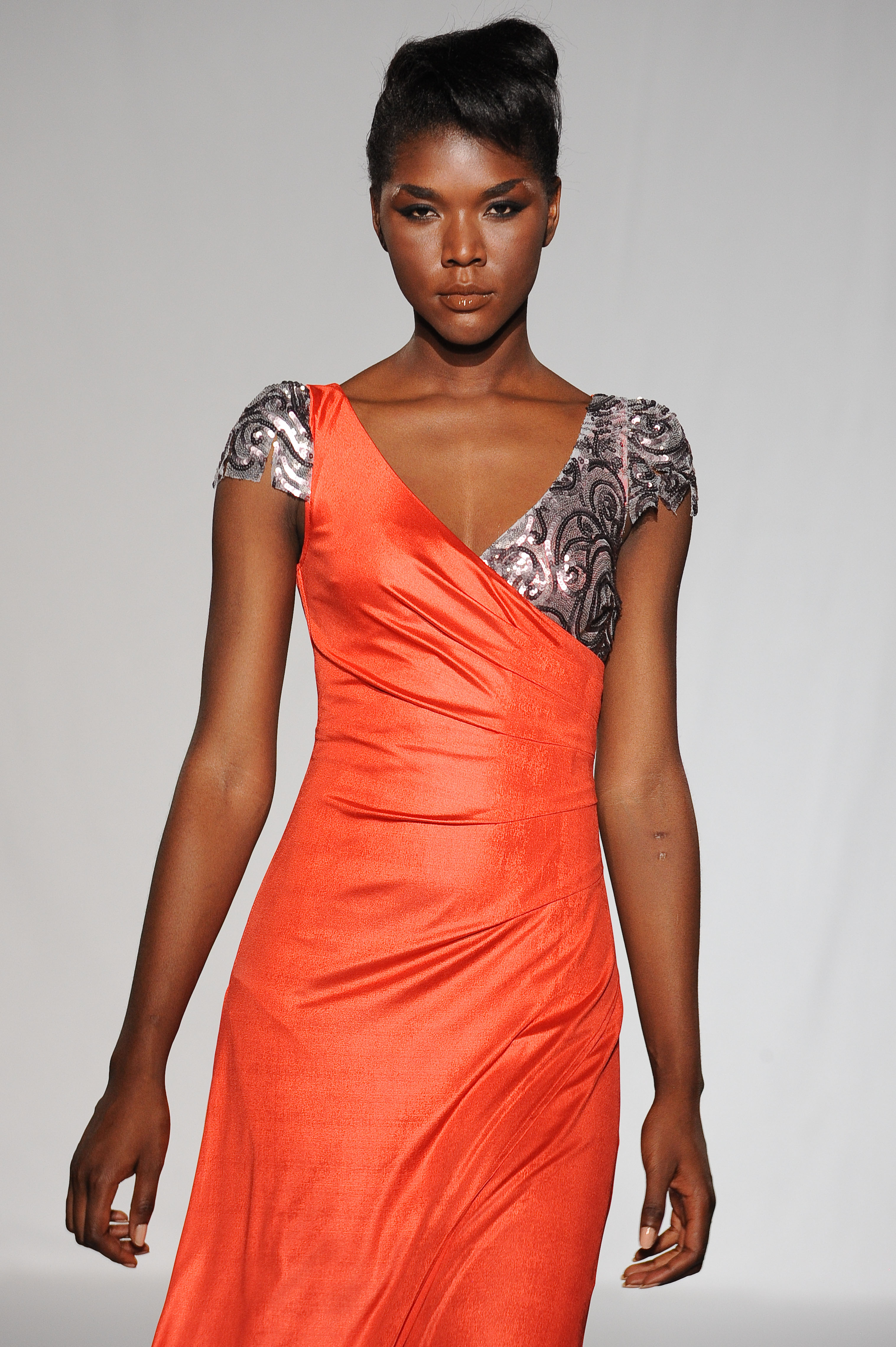 Fourreau en jersey rouge et tulle recouvert de sequins argentés. Red jersey gown mix with mesh covered with silver sequins. Jasie