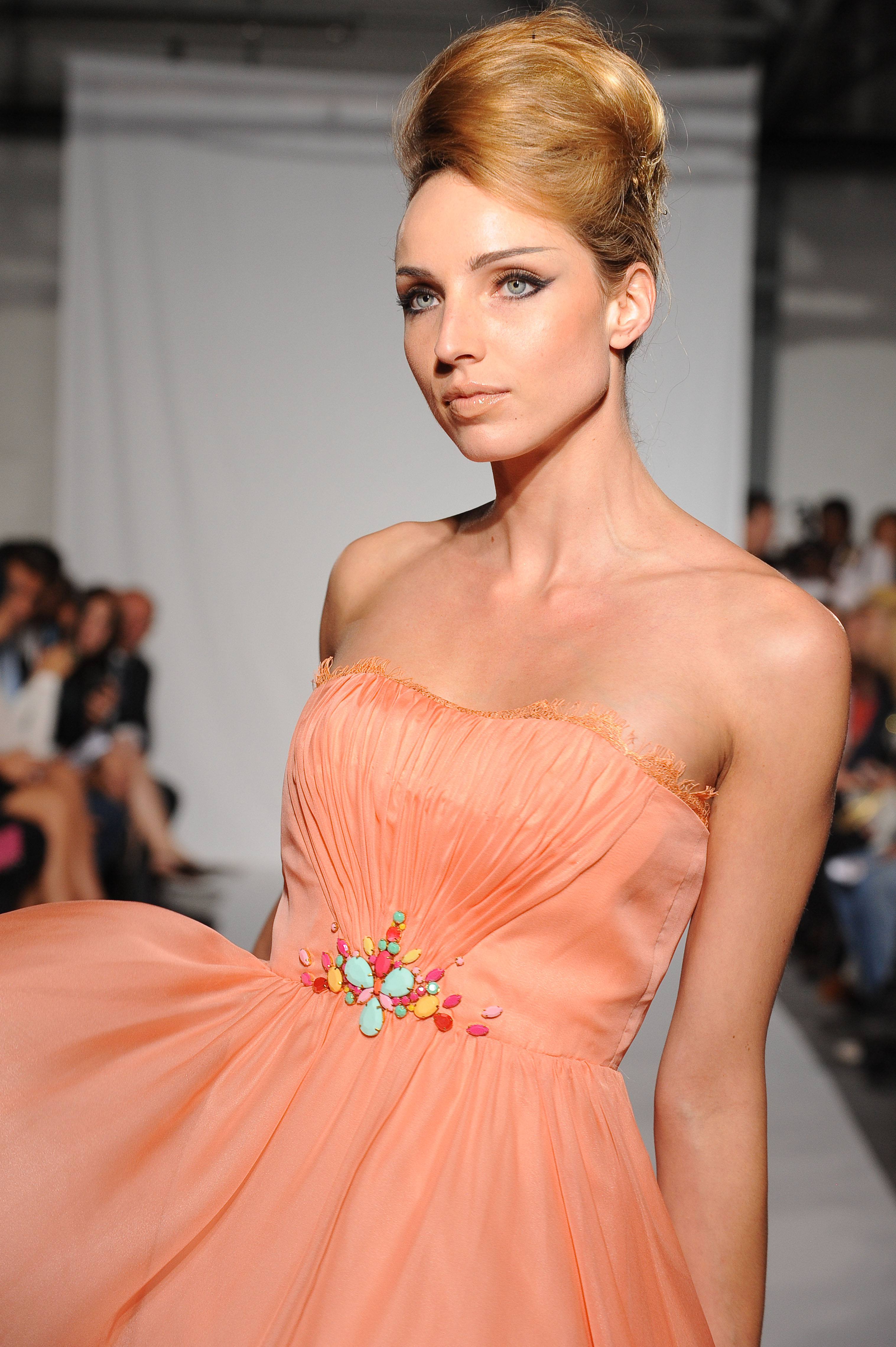 Robe bustier en mousseline de soie pêche au buste drapé. Peach silk chiffon bustier dress with draped bust. Olivia