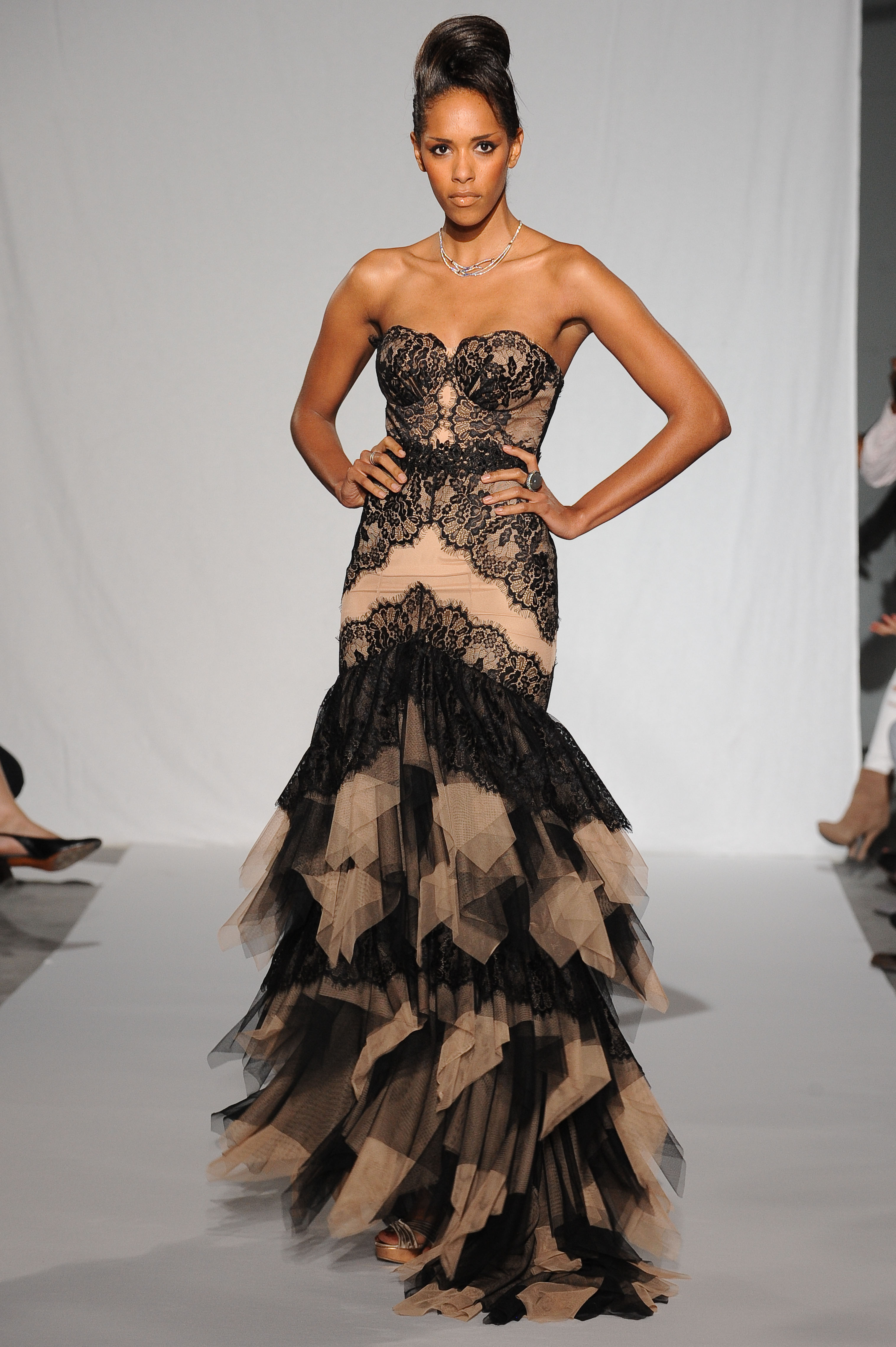 Longue robe nude appliquée de dentelle noire et volants en tulle nude et dentelle. Mermaid nude bustier dress applied with black lace and frills in nude tulle and lace. Mandy