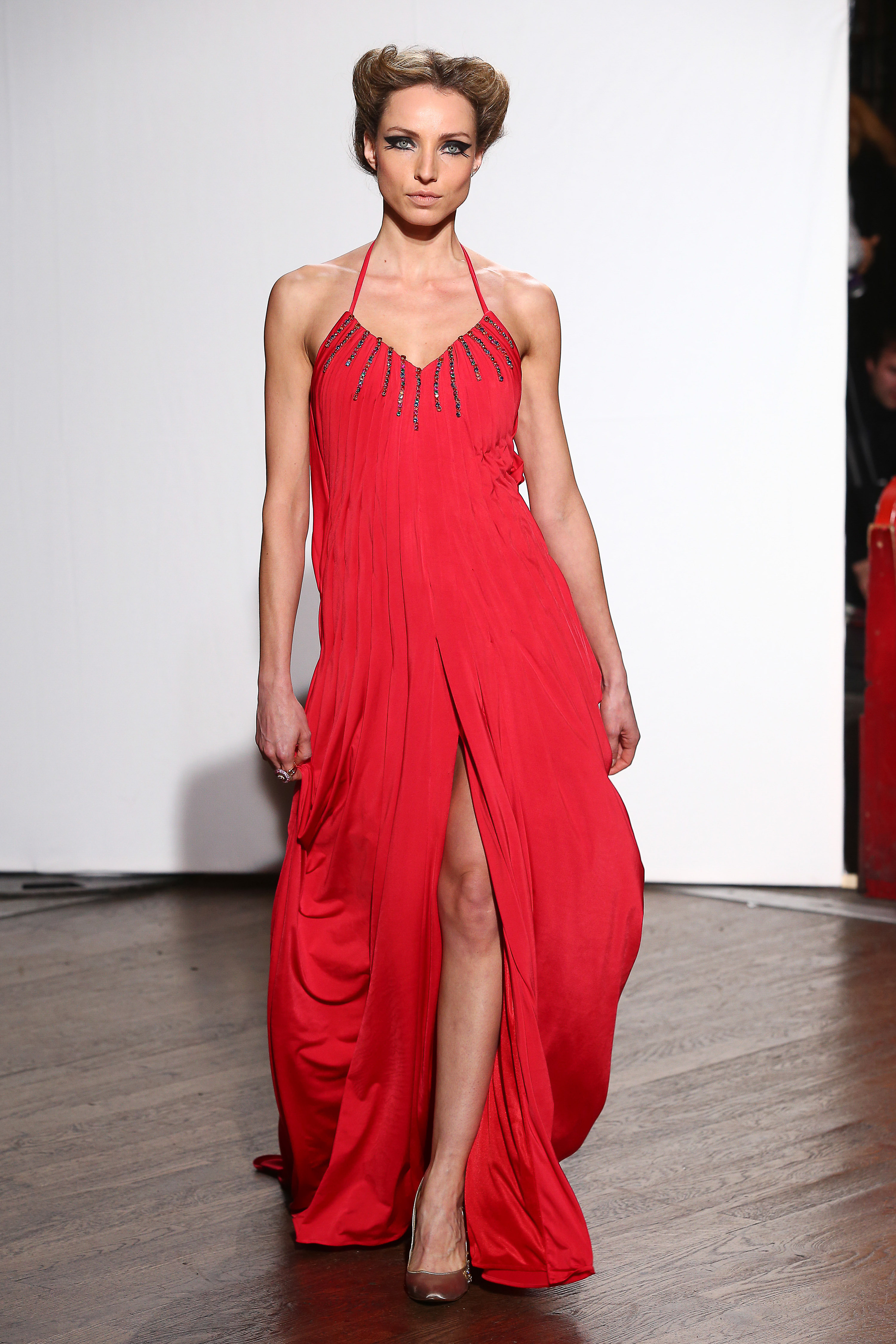 Fourreau en jersey rouge dont les plis forment un drape. Red jersey gown ending with draped pleats. Olivia.