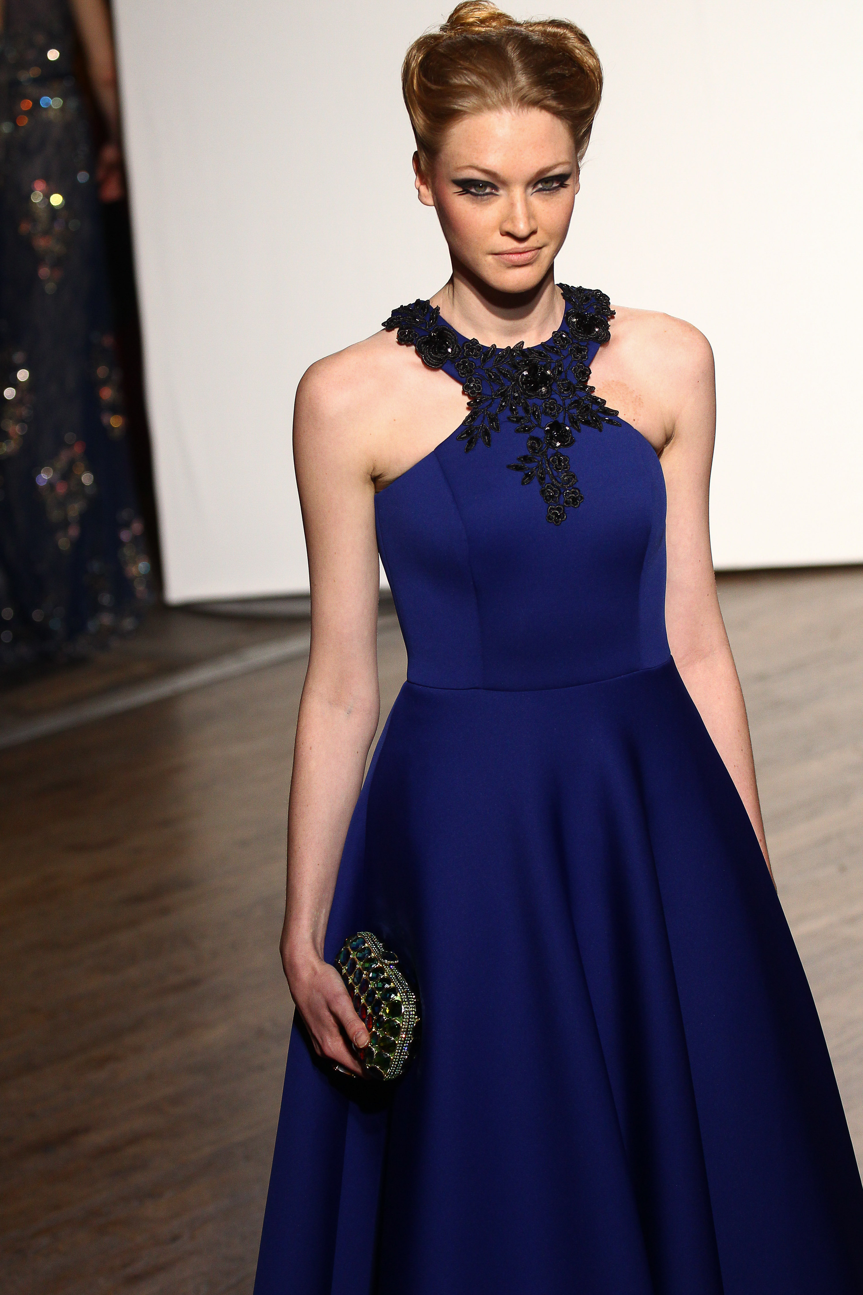 Maxi robe en neoprene bleu marine dont l’encolure est appliquee de dentelle noire rebrodee. Navy blue neoprene maxi dress with applied beaded lace on neckline. Tessa.