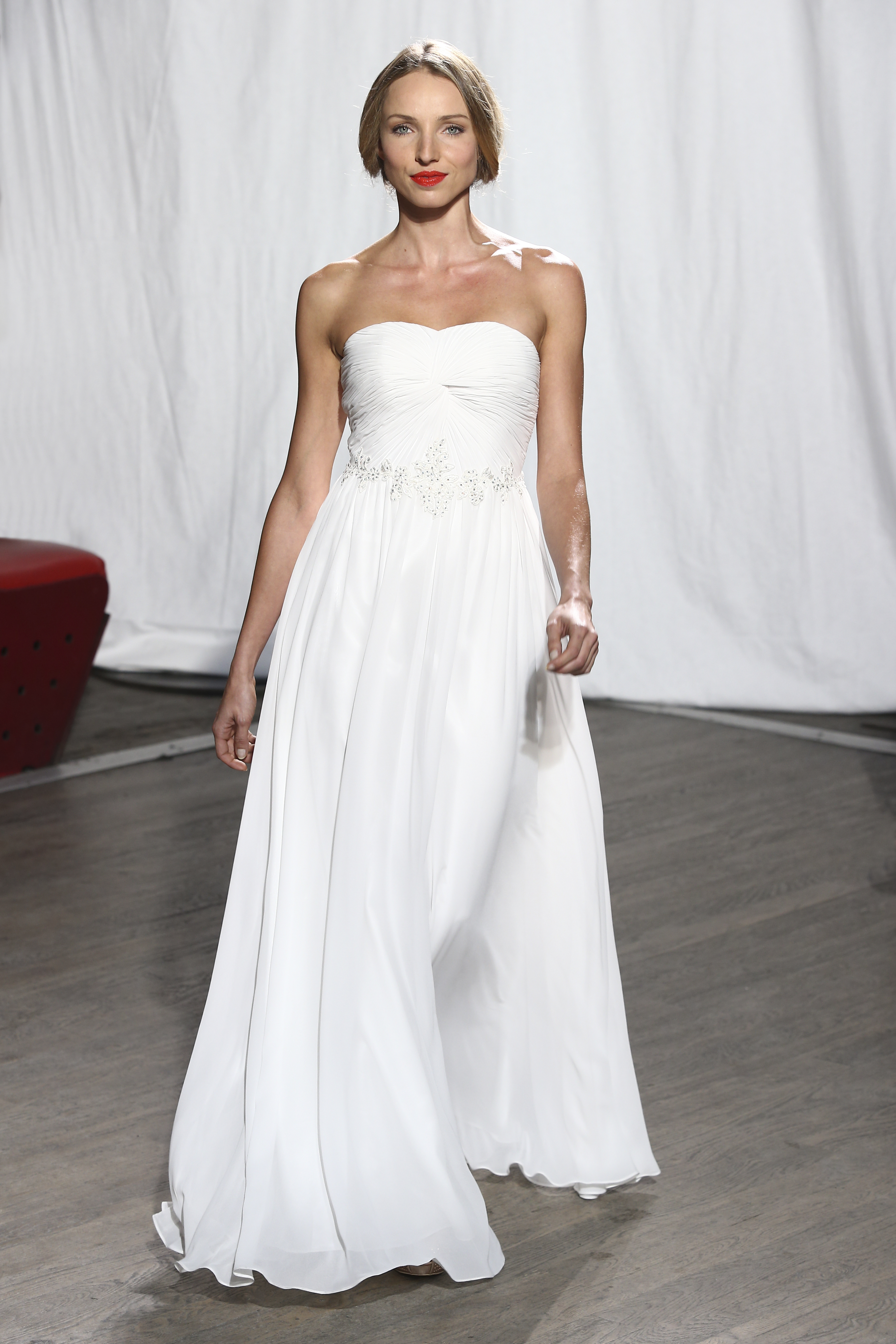 Longue robe bustier drape en georgette de soie blanche appliquee de dentelle à la taille. White long strapless and draped dress with a lace waistband. Olivia -