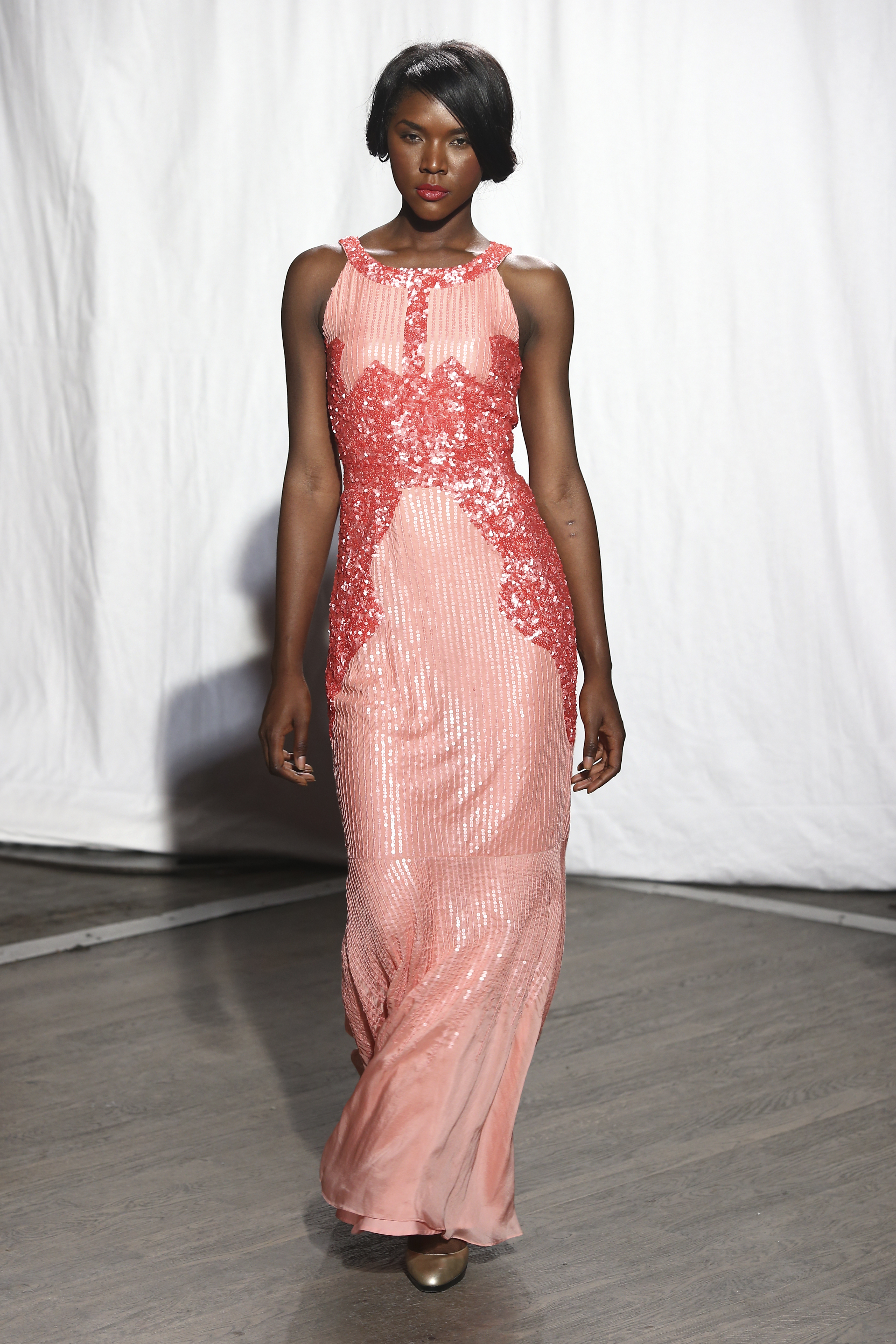 Long fourreau en mousseline de soie corail recouvert de sequins. Coral pink silk chiffon gown fully covered with sequins. Jasie -
