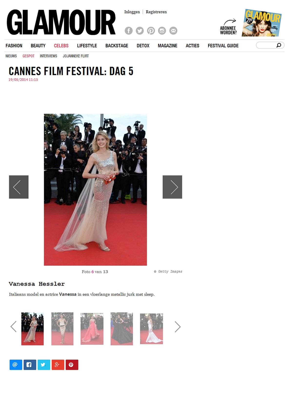 Jour 05 - Dimanche 18 Mai - 19h30 - La comédienne Vanessa Hessler dans une longue robe beige transparente rebrodée de sequins Christophe Guillarmé, avec une pochette Carmen Steffens coiffée par Eros Giuliani et maquillée par Make Up For Ever