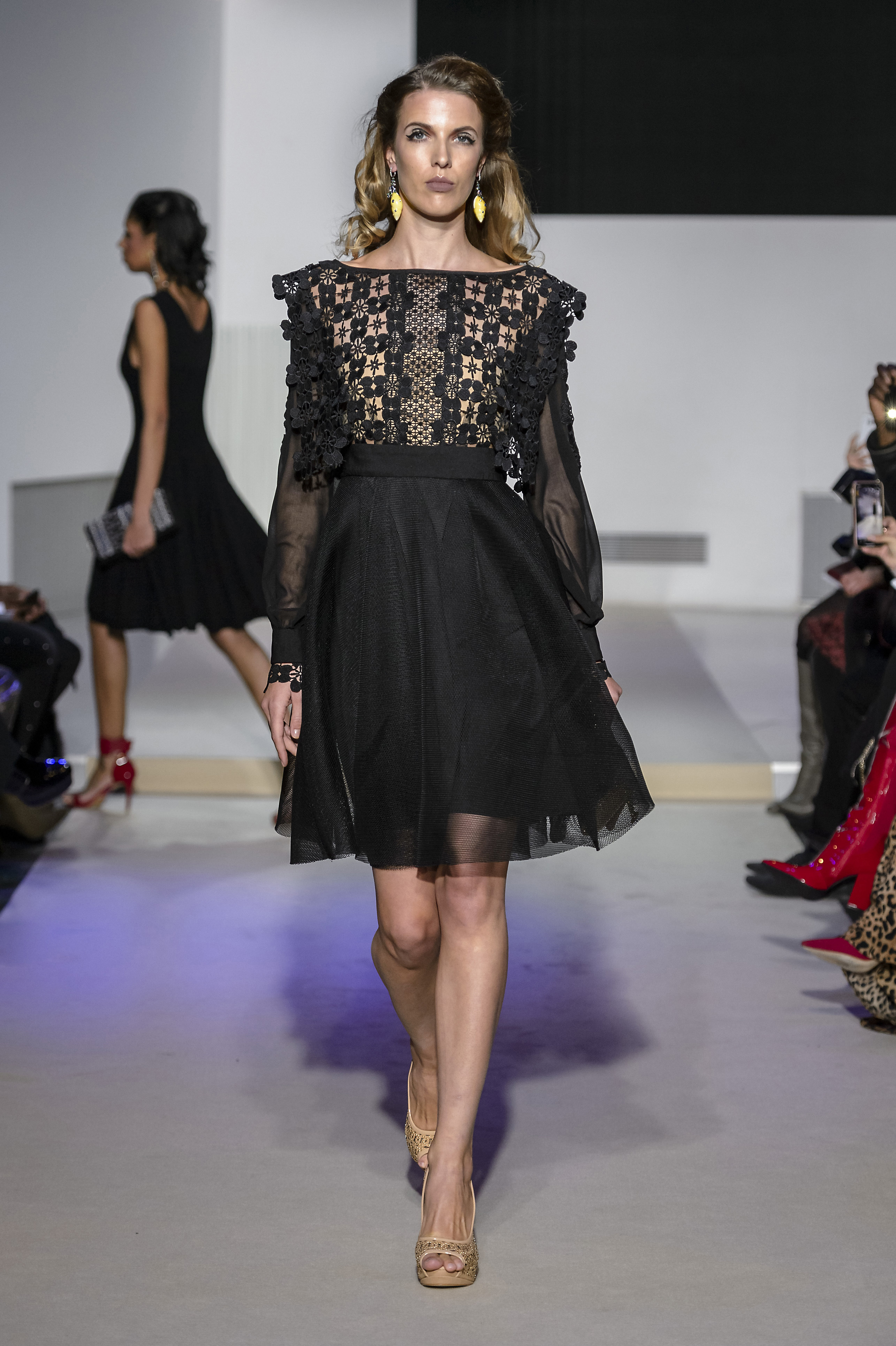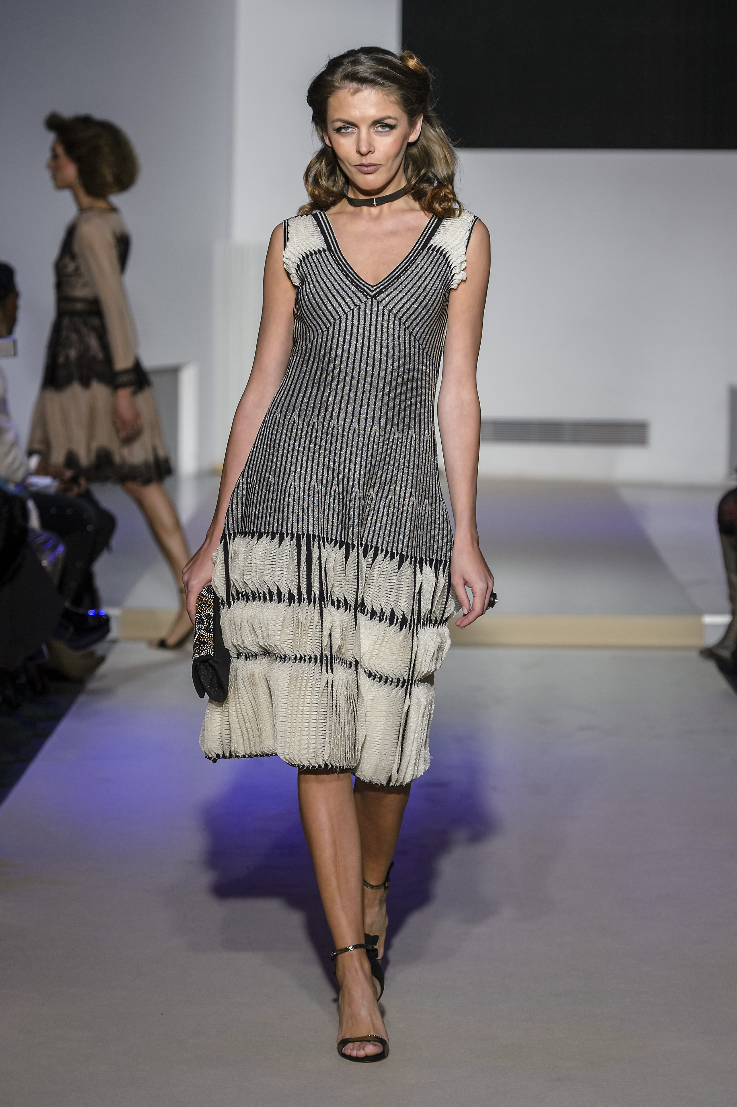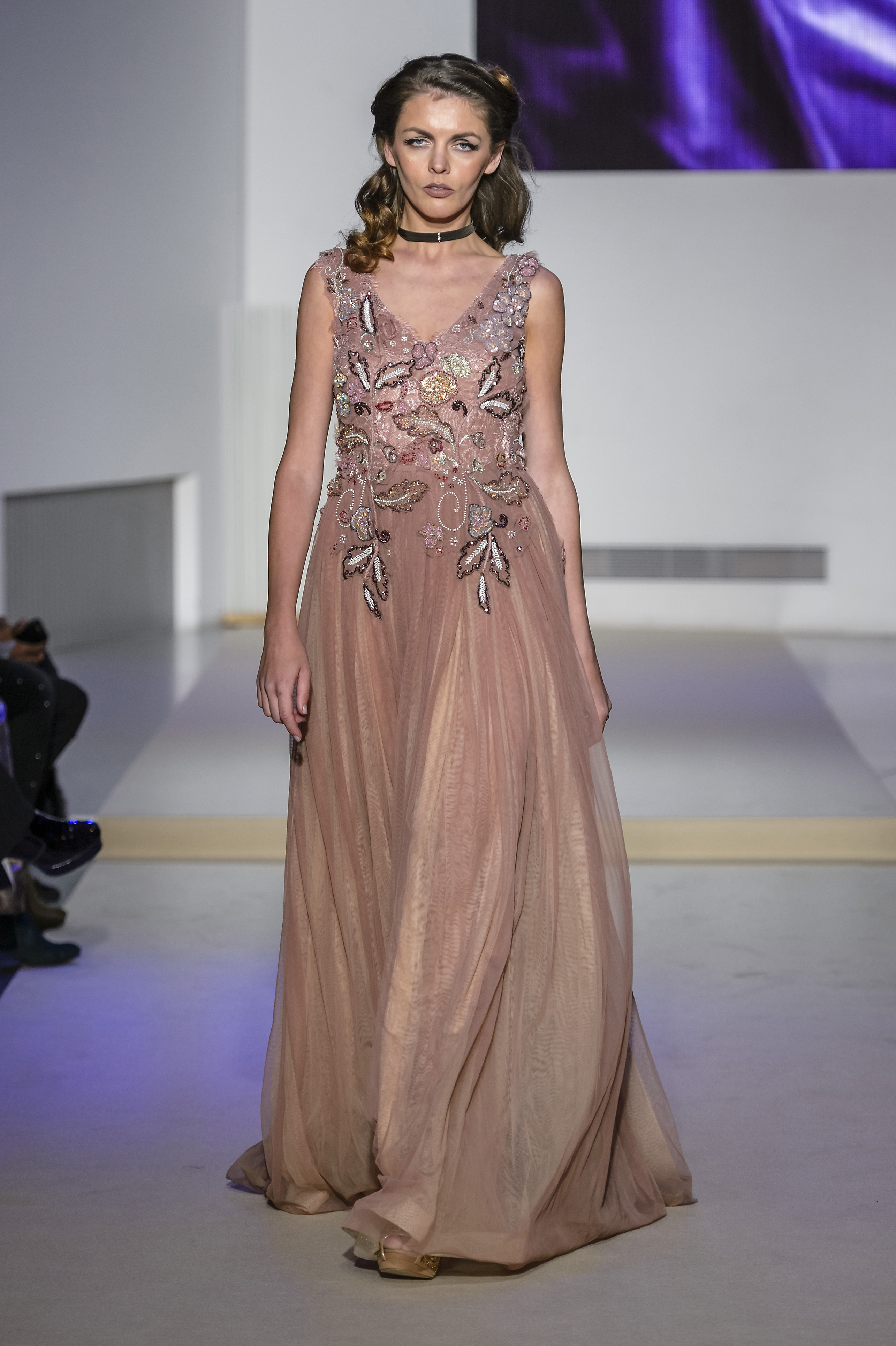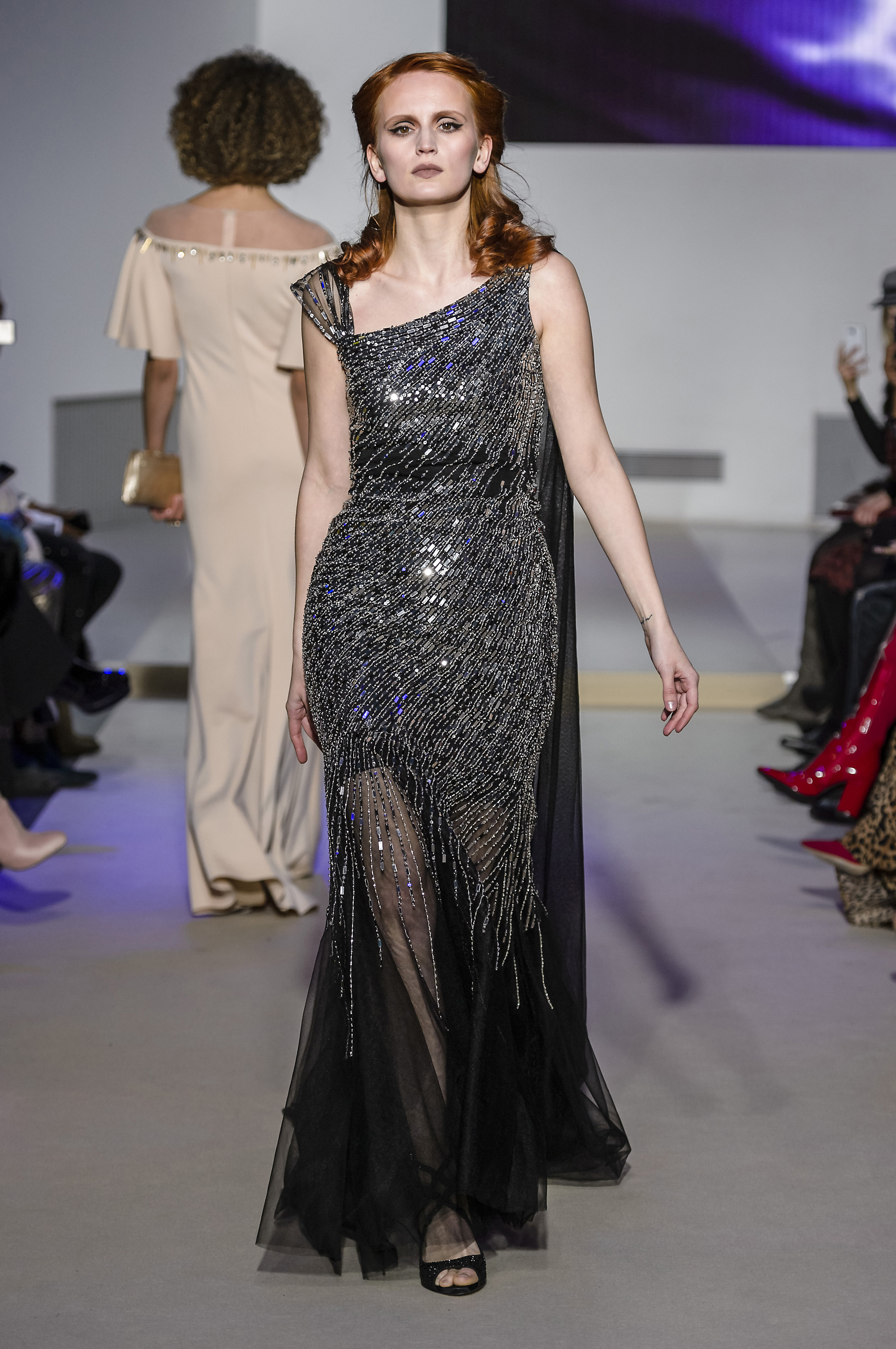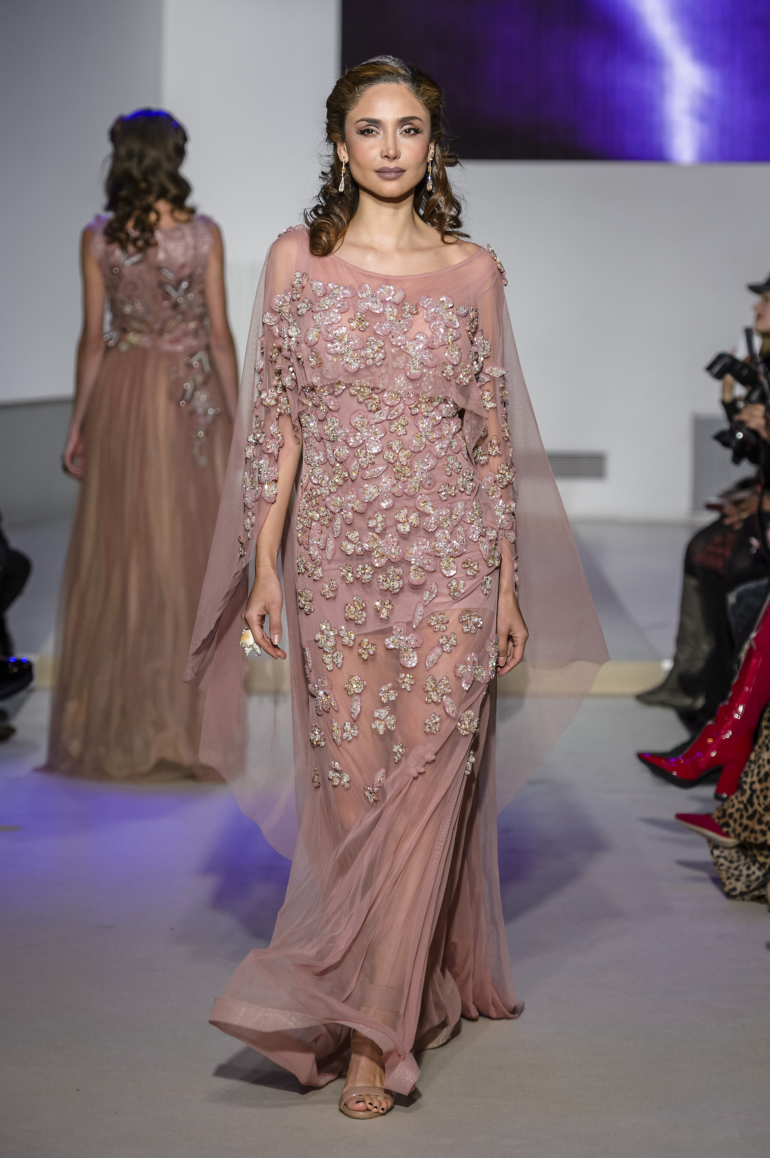 Layering of petticoats in seethrough tulle seems to be a current vision of gorgeous Nefertiti, temptress and delicate. She also reveals herself magnificent in an incredible strapless cloak dress. Declinations of beaded crystal baguettes adds sparkles and glamour into this digital world to this surviving icon from Dolce Vita, that reflects in this mystical and enchanting collection.