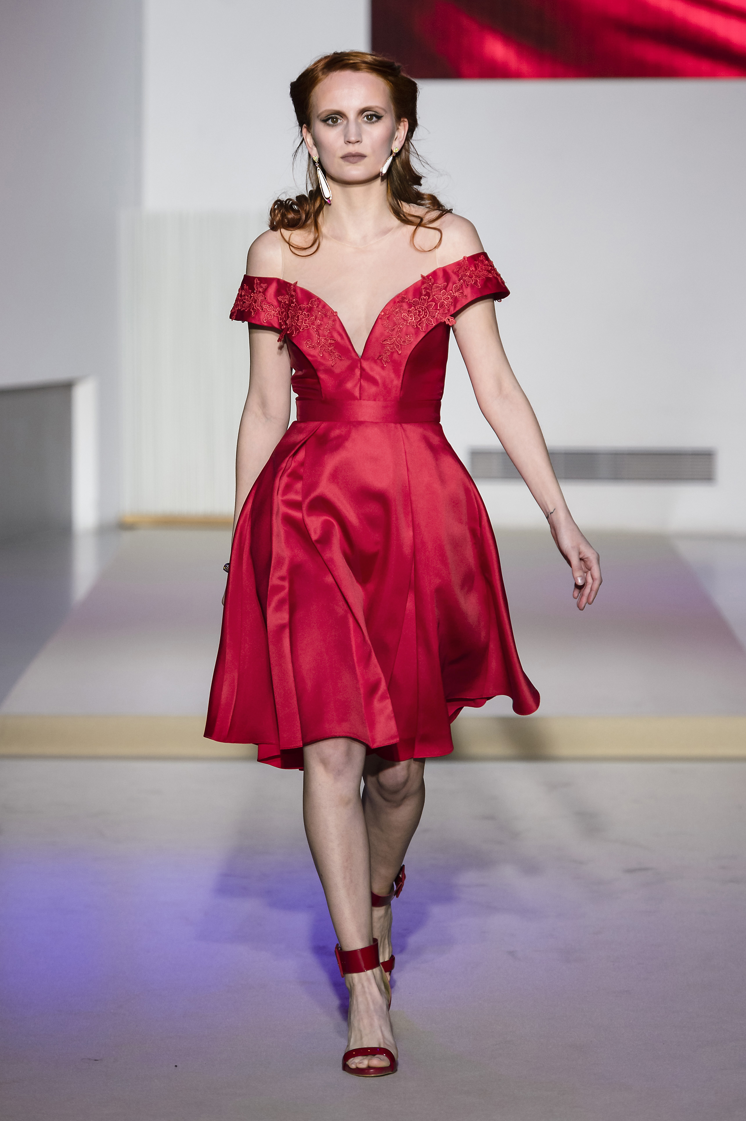 Evanescent tulle is prominent in gold sand or dusty pink colors, while mikado is shaded in red ruby embellished with tone on tone lace and used off the shoulders, or draped with gleaming technicolor print of papyrus patterns on black background. The Queen boldness is also into the shapes as in millefeuille cuts effect of flounced plumetis or in contemporary papyrus folding construction inspired by origami in plum colour.