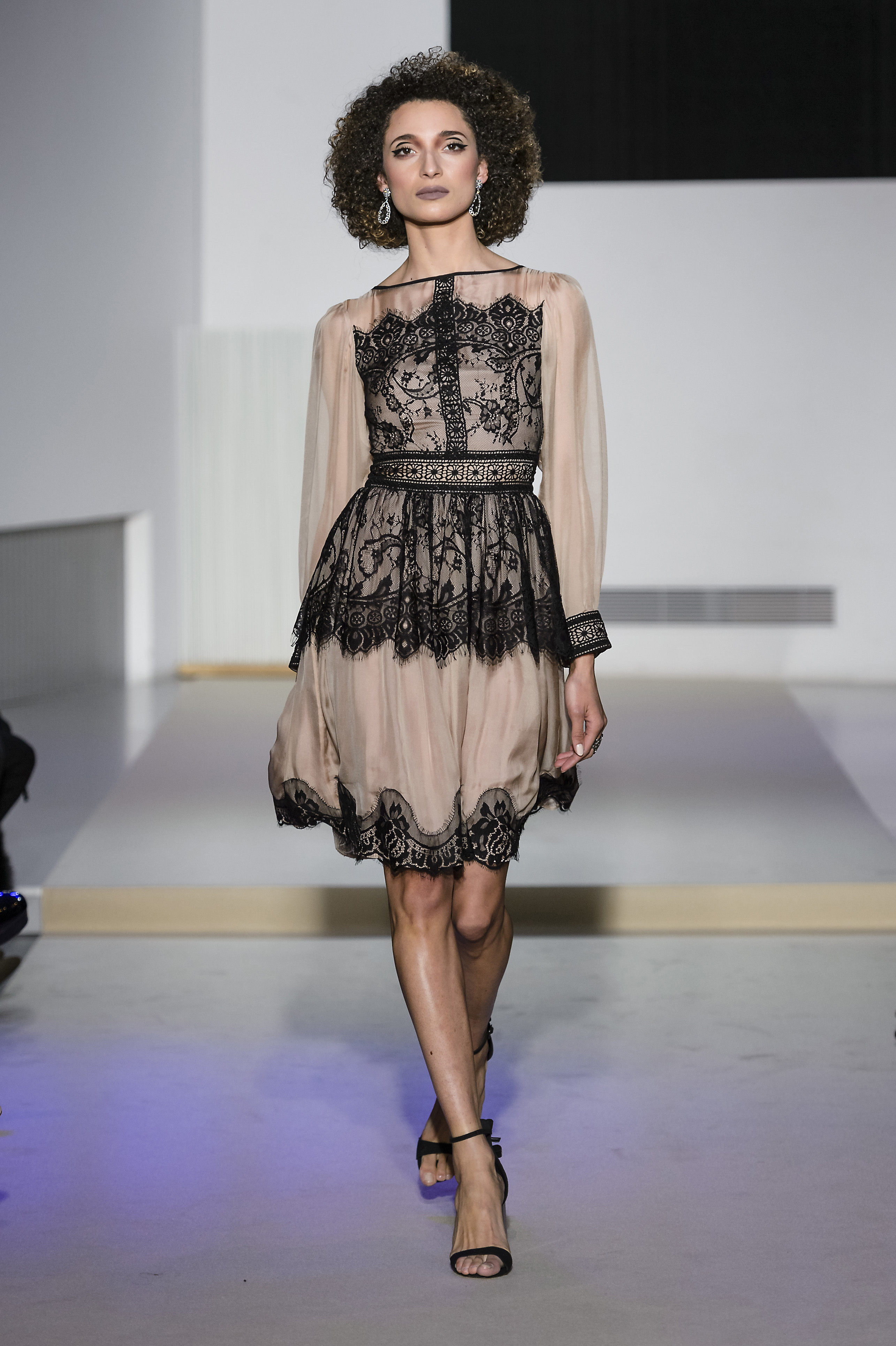 look 6 - robe courte a manches, mousseline de soie chair agrementee de dentelle noire short sleeve dress in nude silk chiffon, embellished black lace - Maylis