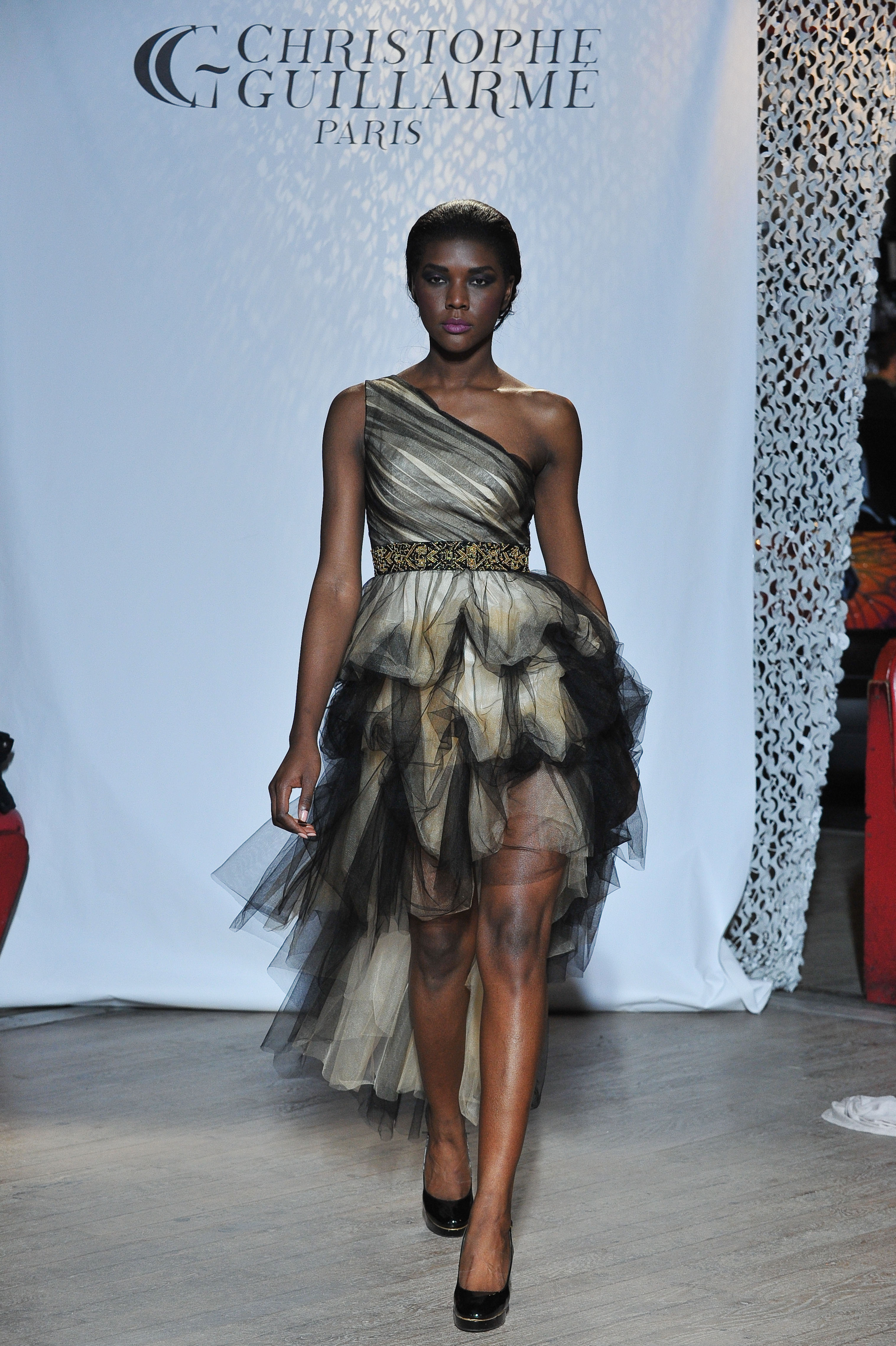 Fall-Winter 2013-2014 fashion show «Boheme» - Christophe Guillarme Paris - Tuesday February 26th 2013 at Balajo - Paris Fashion Week - Robe asymétrique en tulle noir doublé d or. - Black and gold tulle asymetric dress. Jasie