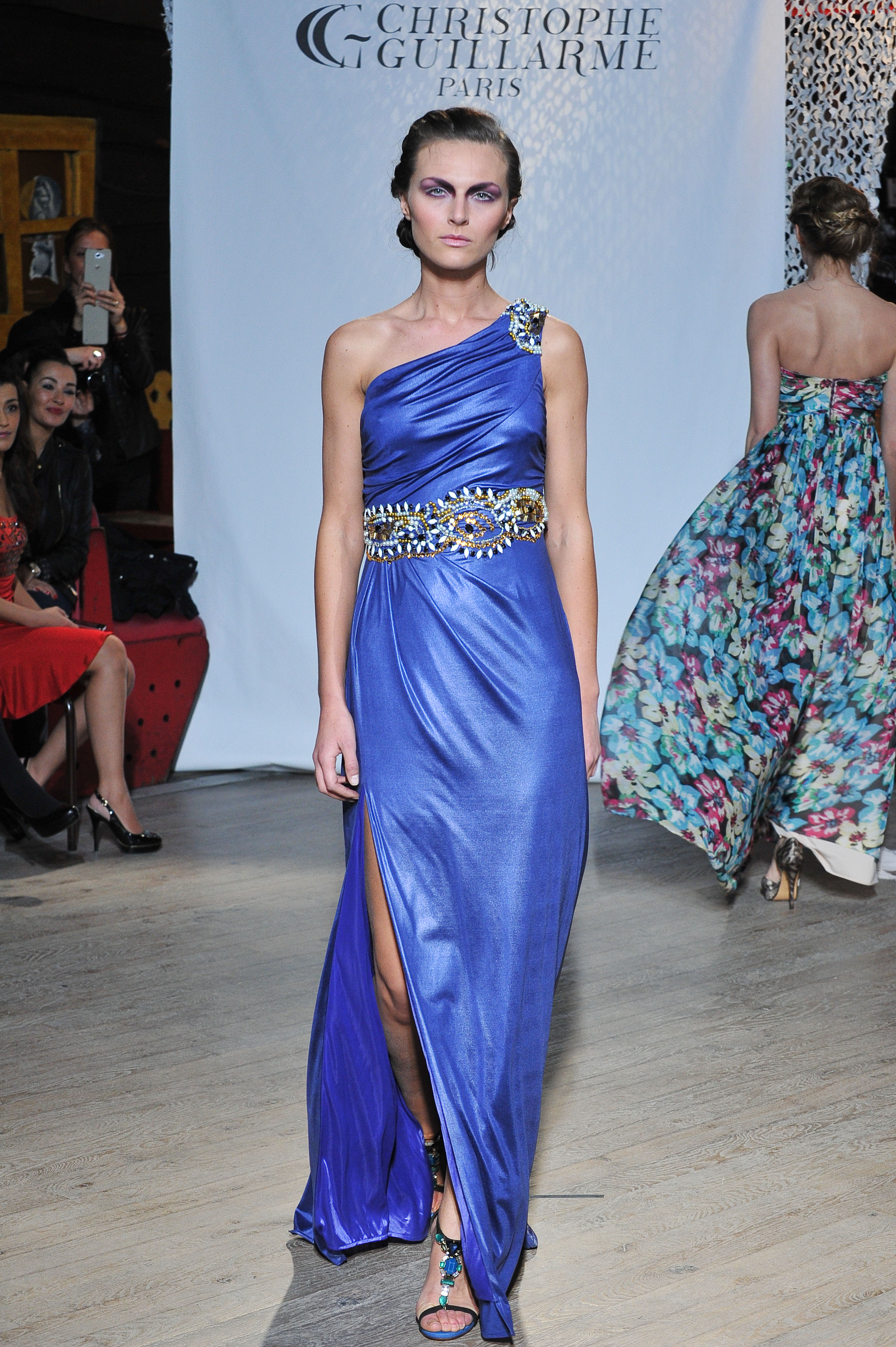 Fall-Winter 2013-2014 fashion show «Boheme» - Christophe Guillarme Paris - Tuesday February 26th 2013 at Balajo - Paris Fashion Week - Fourreau drapé asymétrique en jersey bleu roi rebrodé. - Draped and beaded royal blue asymetric gown. Lucie