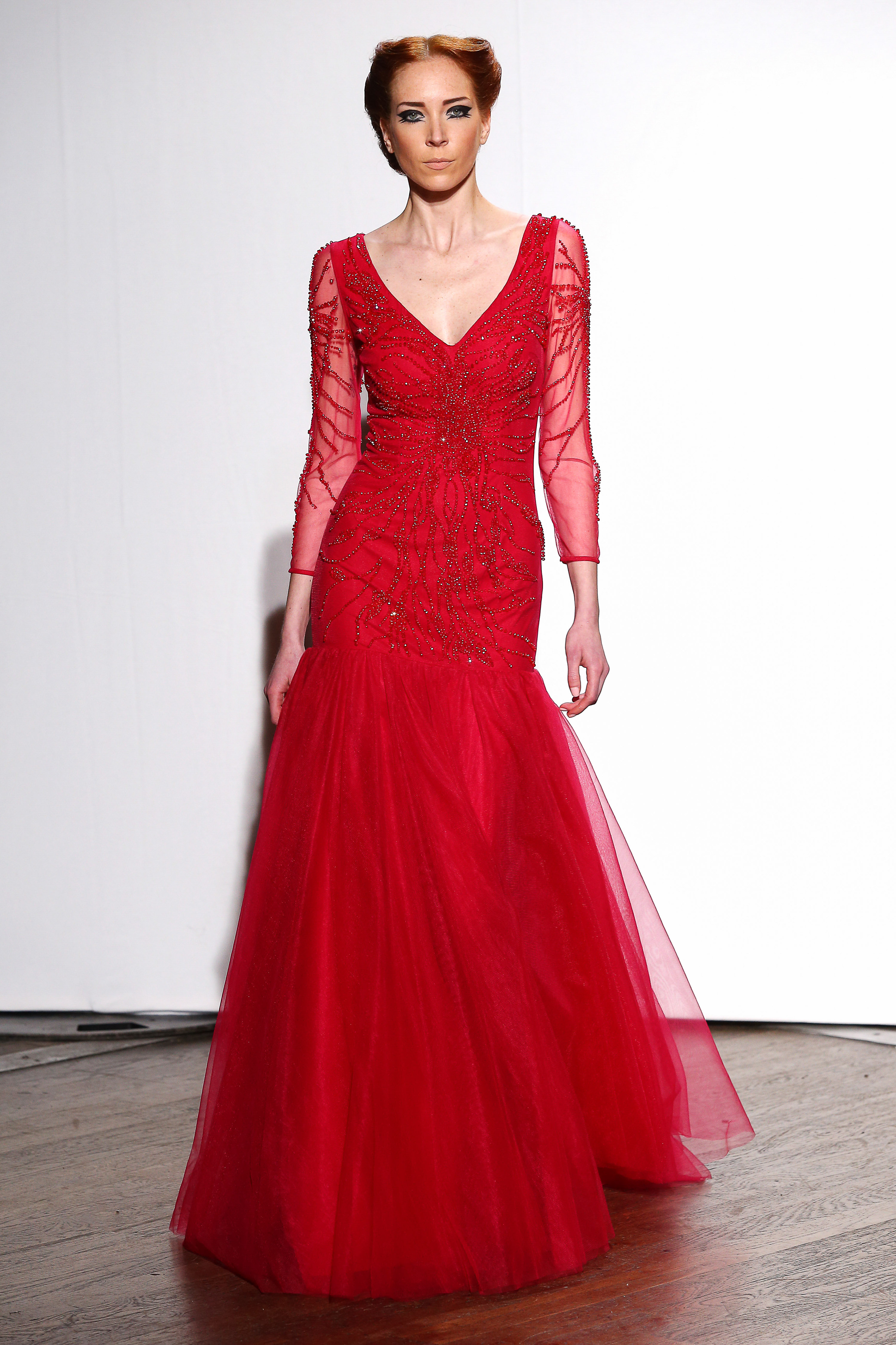 Maxi robe sirene en tulle rouge dont le corps est recouvert de lignes de rocailles brodees. Red tulle maxi mermaid dress beaded with line of crystal stones. Johanna.