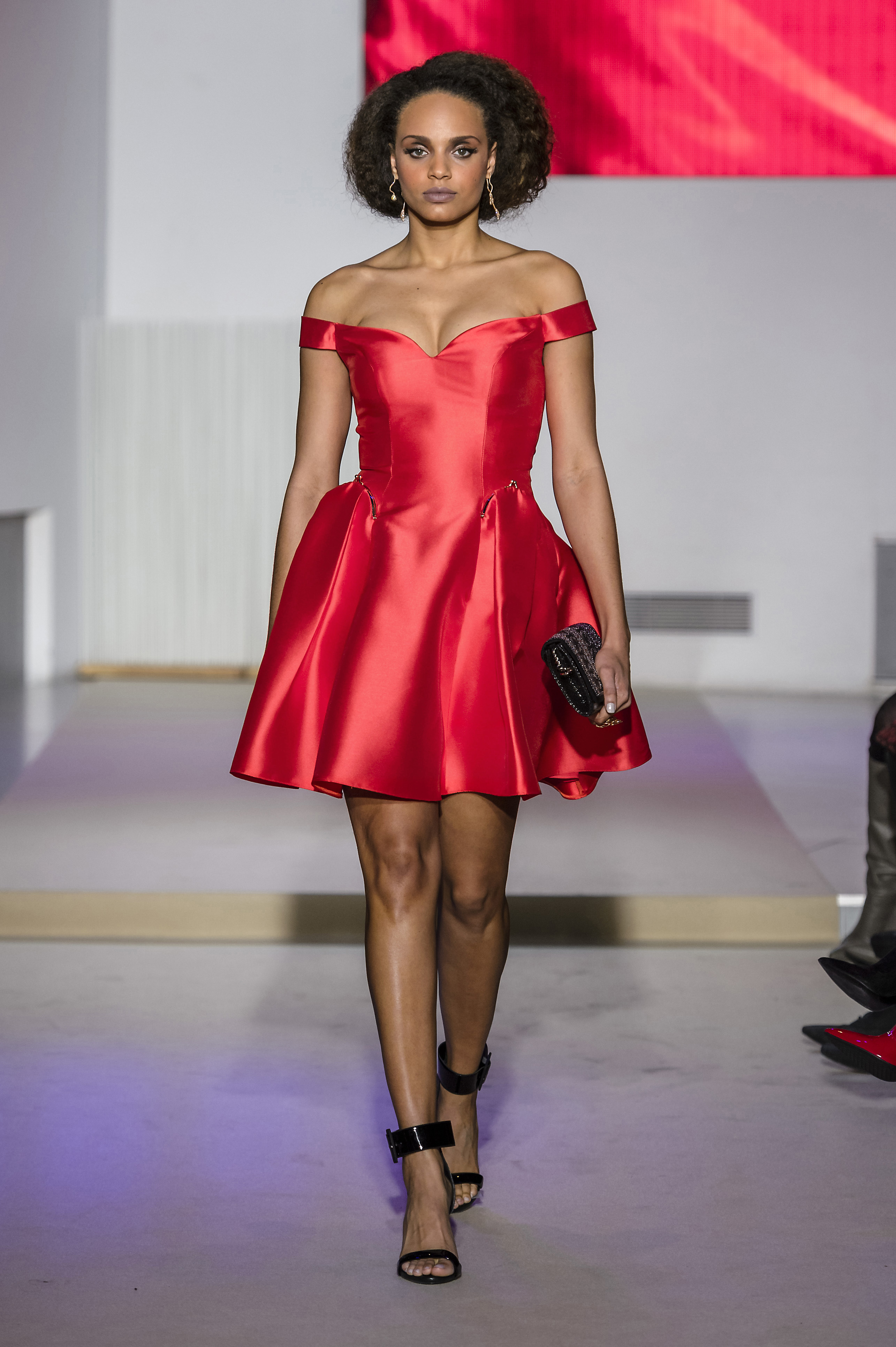 look 10 - robe courte en faille de soie rouge a encolure bateau, appliquee de dentelle wearing short off the shoulders dress in red mikado with lace embellished - Alicia Aylies