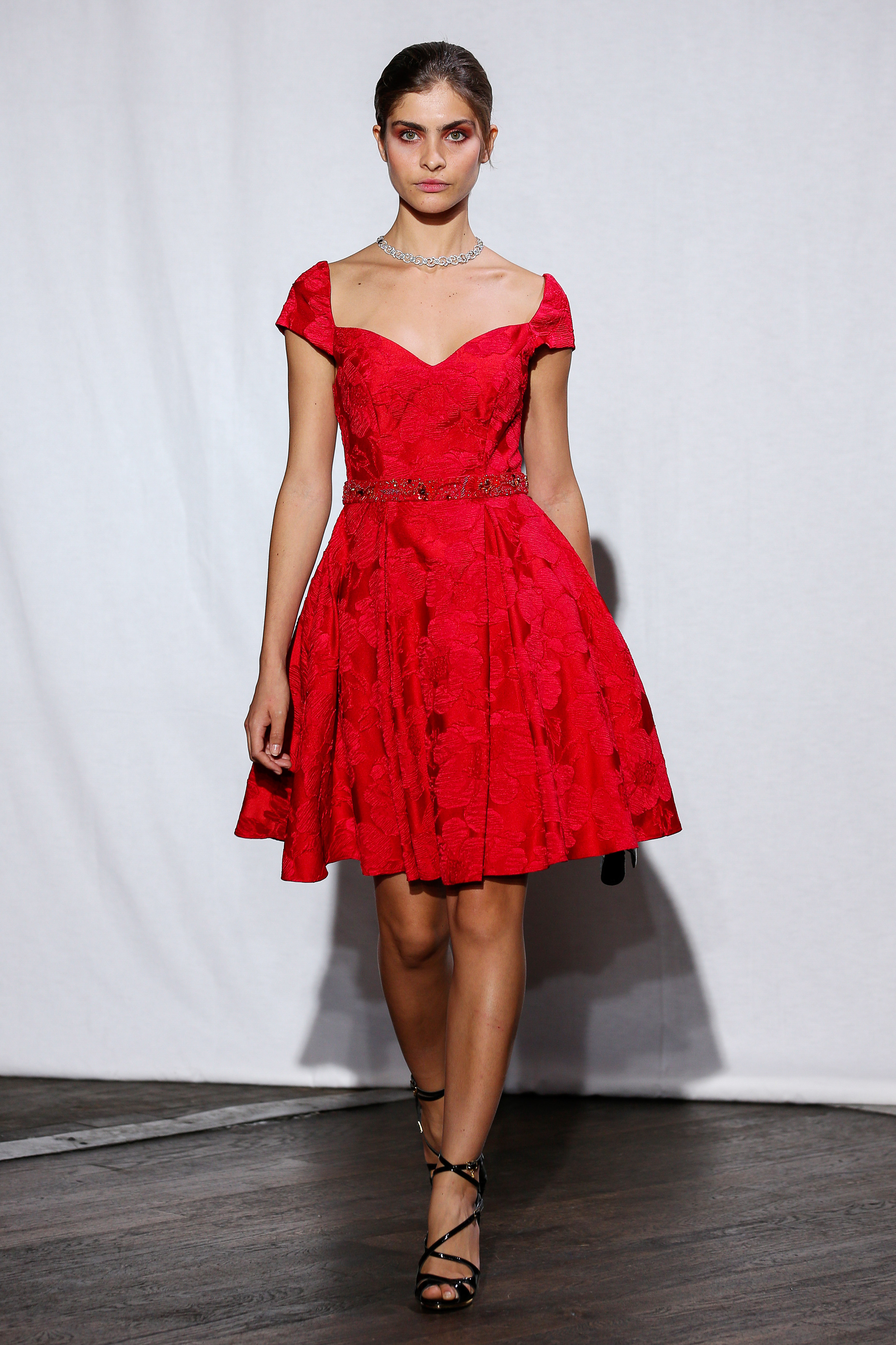 Christophe Guillarme - Collection Printemps-Ete 2017 - Bloody Madone - Balajo - PFW -1st look - mini robe en brocart de soie fleurie rouge avec ceinture rebrodee amovible - red brocade mini dress with removable beaded belt - Carol
