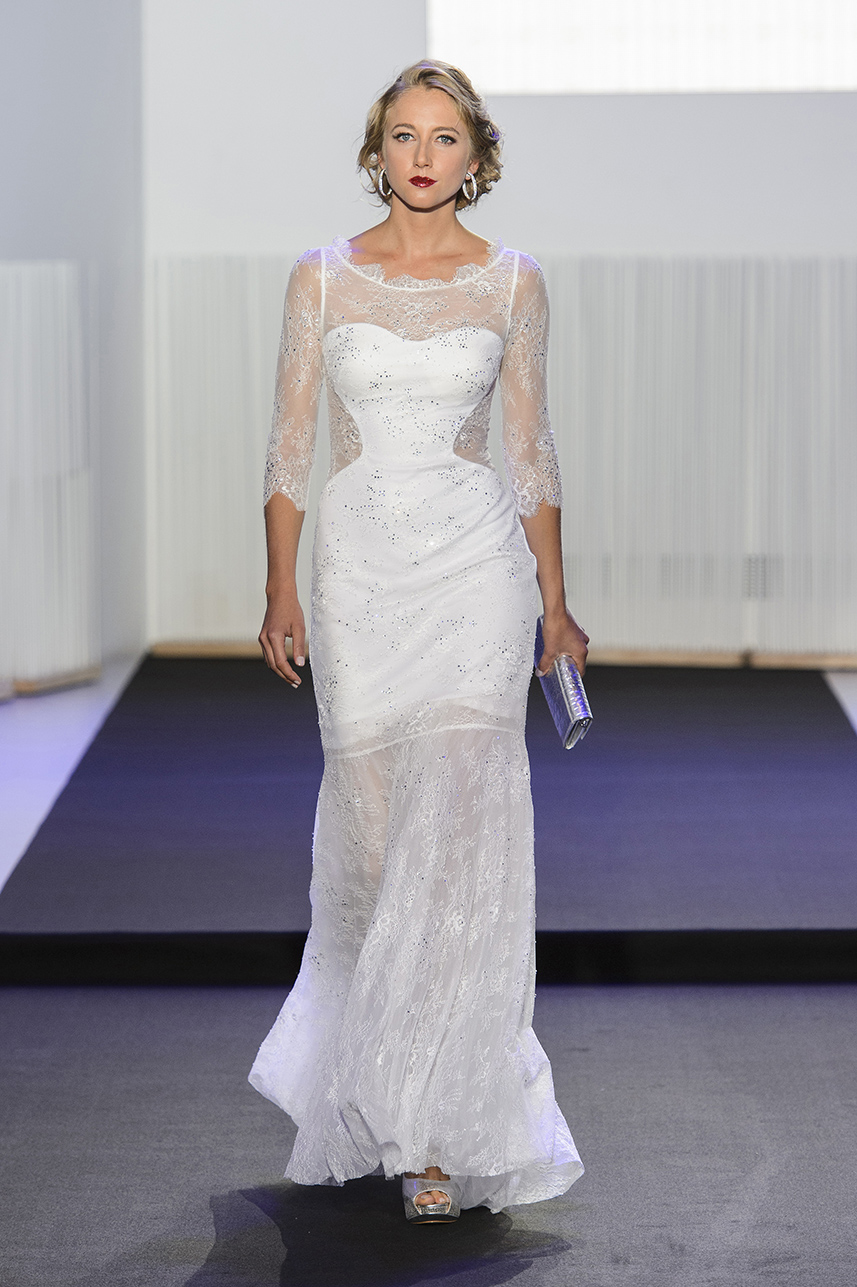 Look 12 - robe longue en dentelle blanche appliquee de cristaux aux manches trois quarts - long white lace dress applied with crystals and three-quarter sleeves - Meryl