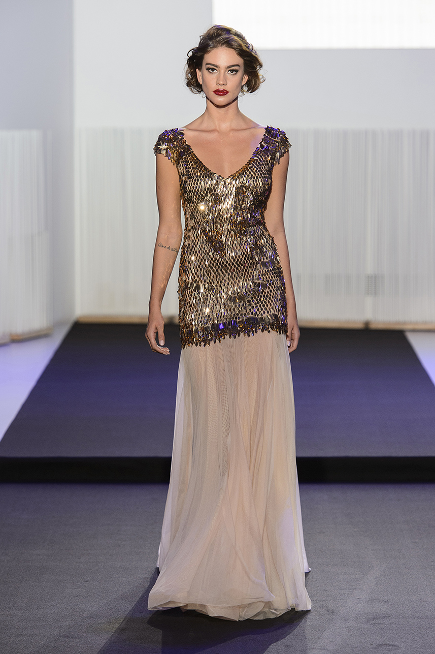 Look 21 - longue robe sirene recouverte de sequins dores et juponnee en tulle nude - mermaid dress covered with golden sequins and tail in tulle nude - Flavia