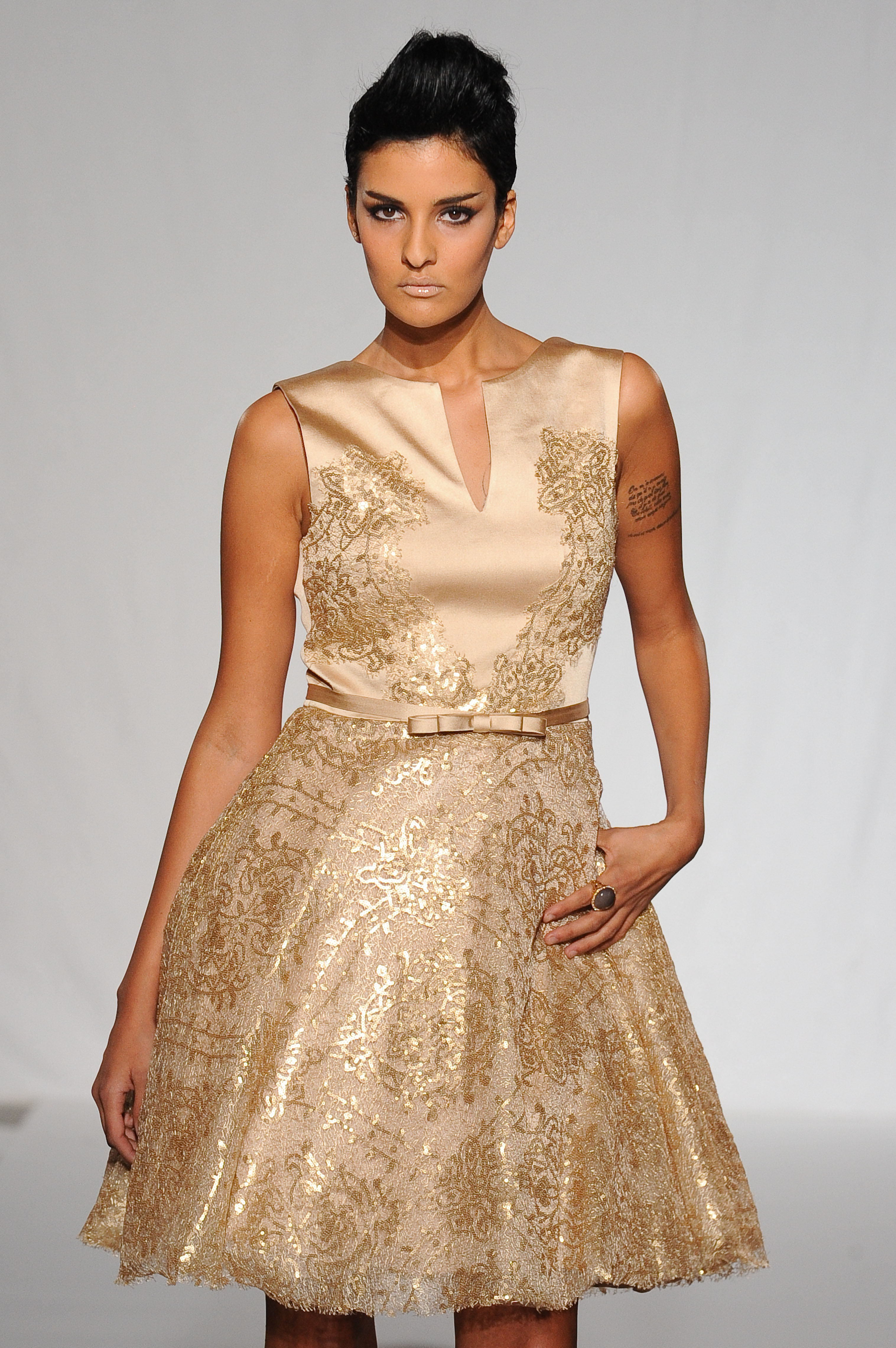 Pour cette âge d’or de la couture quoi de plus naturel que d’honorer le doré souvent marié au blanc immaculé, ou bien au champagne et au beige. Les teintes qui réveillent la collection sont le rose fuchsia, le corail et le rouge lipstick. Le noir demeure pour des fourreaux dramatiques avec des jeux de transparence.