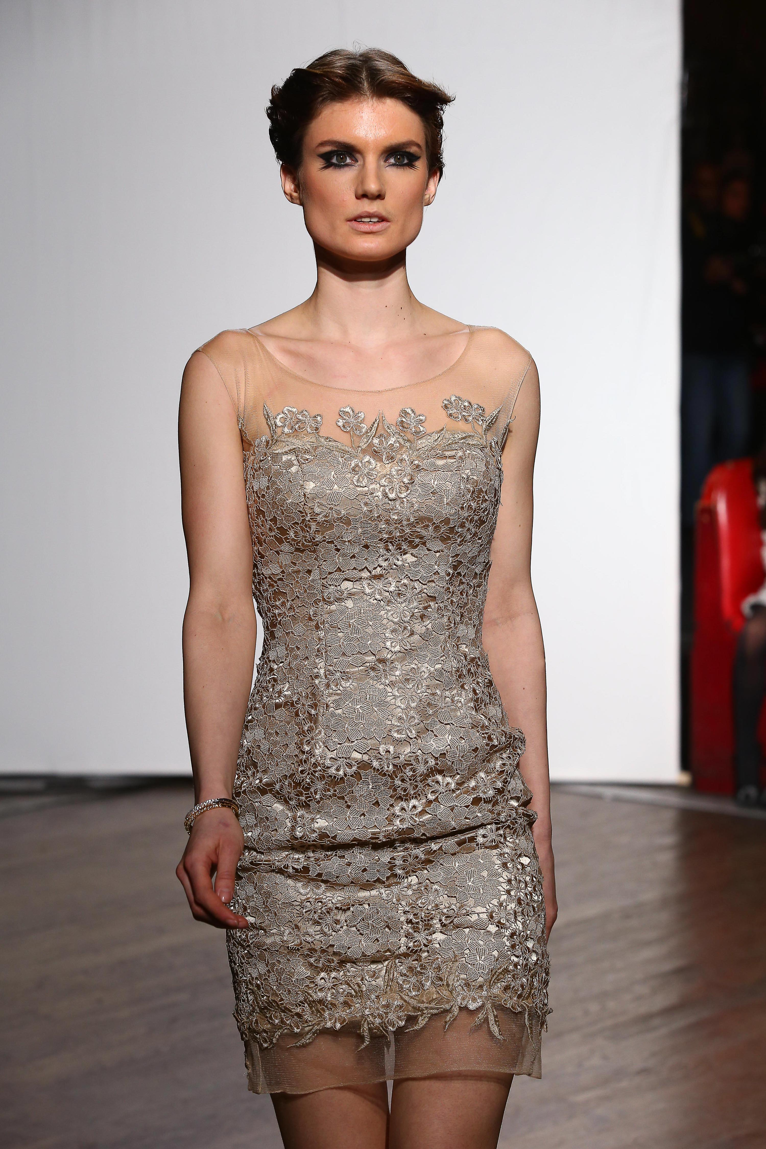 Mini robe en dentelle fleurie beige. Beige flowery lace mini dress. Sophie.