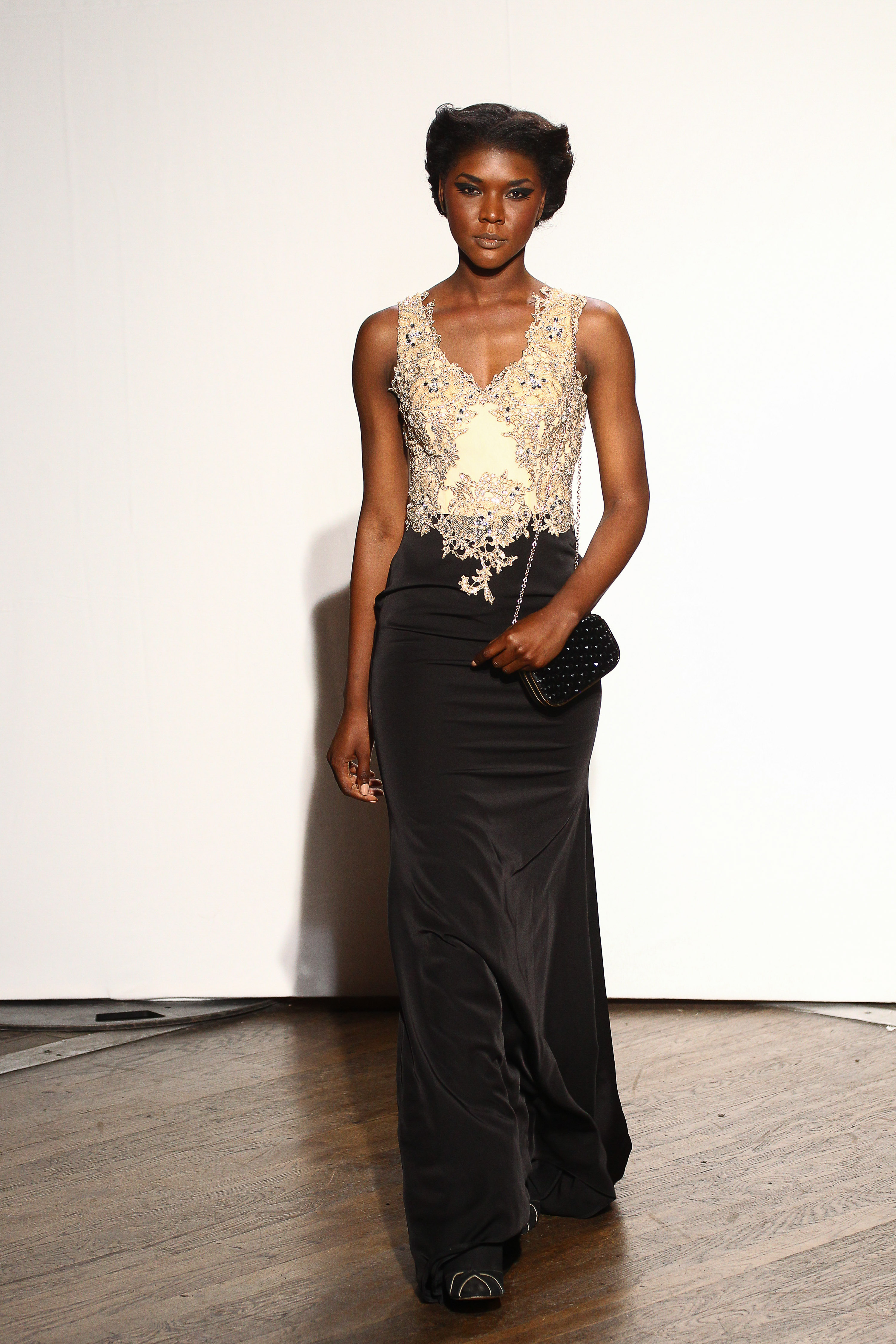Fourreau en crepe stretch noir dont le buste en tulle est applique de dentelle rebrodee et strassee. Black stretch crepe gown with tulle on the bust applied with beaded and encrusted rhinestones lace. Jasie.