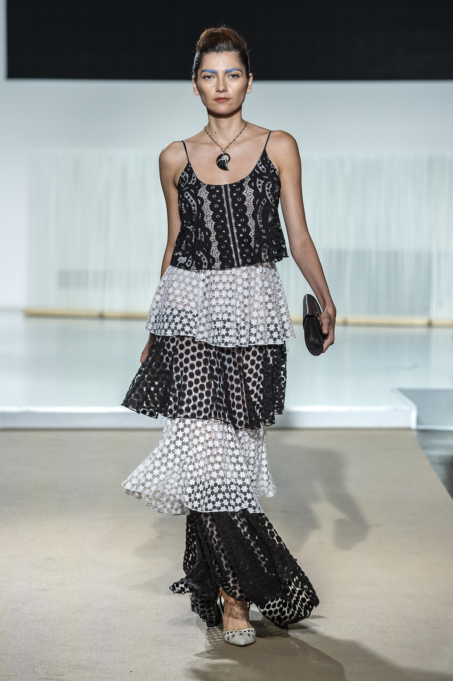 look 9 - robe longue a etages alternant le noir et blanc en tulle entierement rebrode de coton - black and white dress with successive frills in tulle embroidered with cotton threads - Blanca Blanco