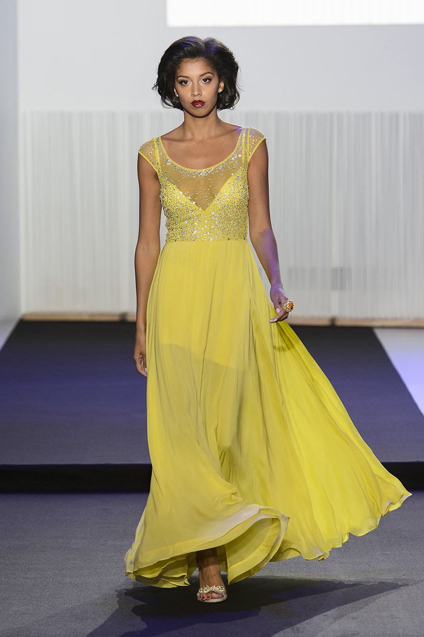Look 10 - longue robe en mousseline de soie jaune au buste en tulle applique de cristaux - long dress in yellow silkchiffon and a bust in tulle applied by crystals - Marjorie