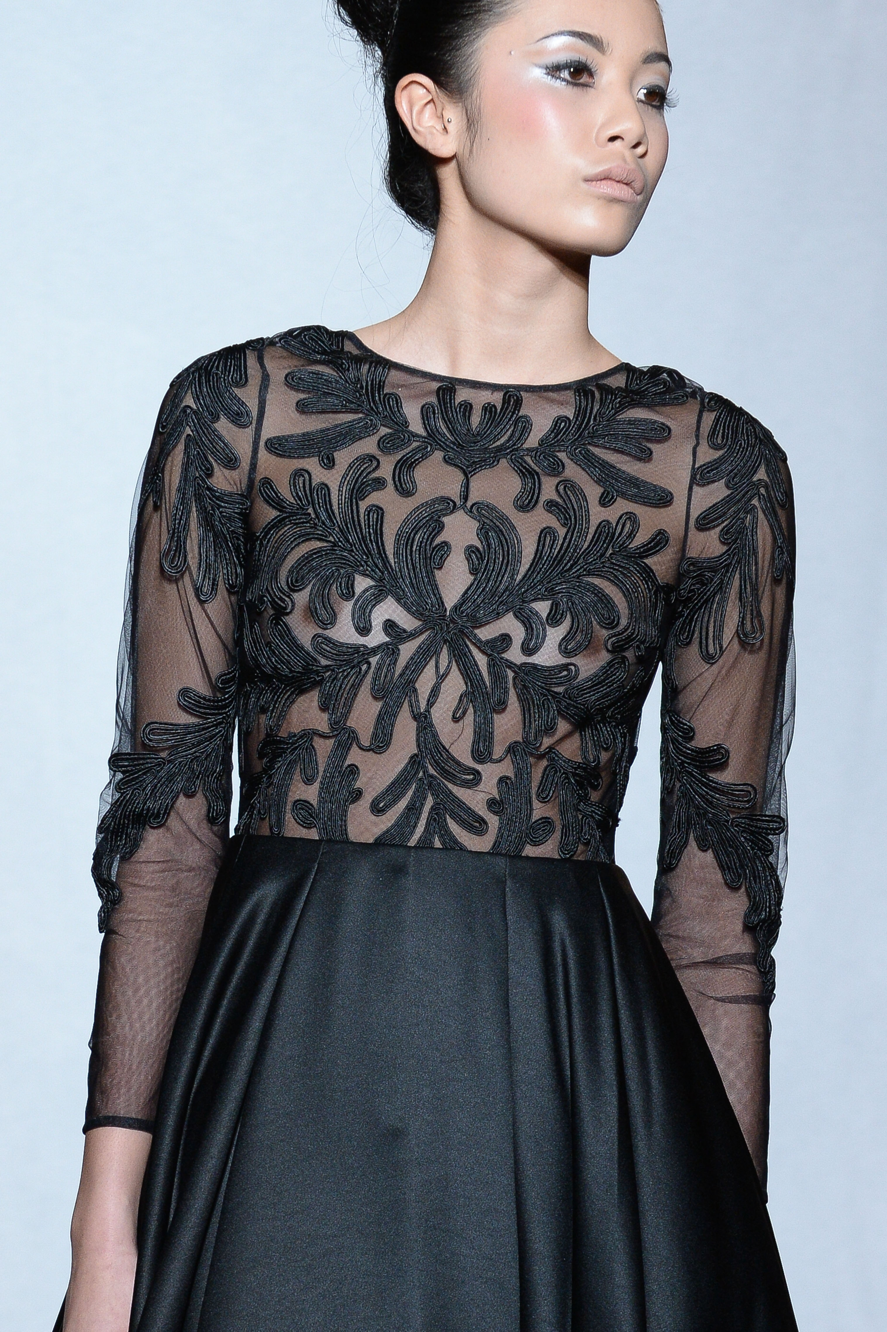 Robe courte à la jupe évasée en satin duchesse noir et buste en tulle transparent rebrodé. Line black duchess satin short dress with sheer tulle bust embroidered. Céline.