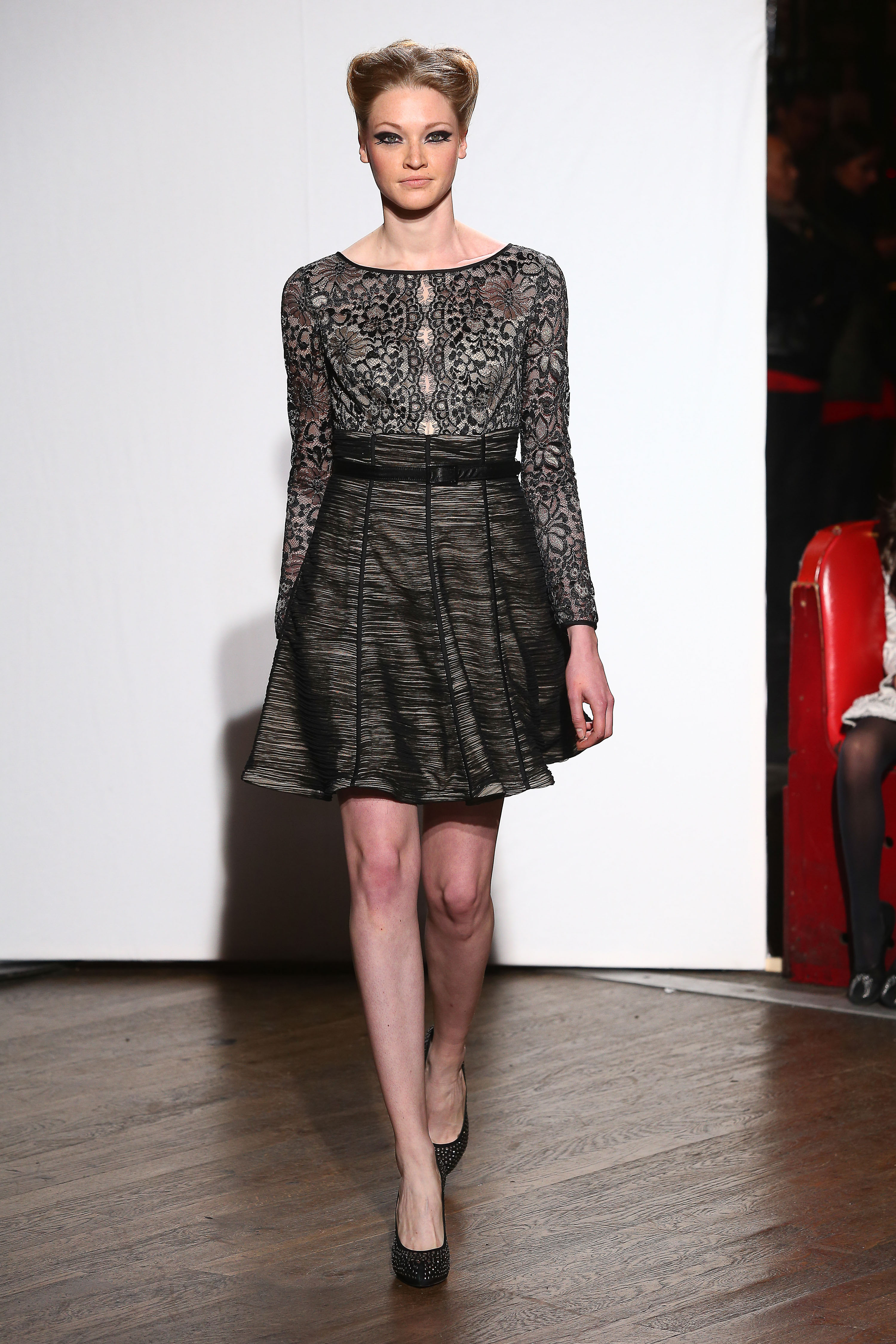 Inspiré par le film « L’Orchidée Noire » réalisé par Martin Ritt avec pour tête d’affiche la sublime Sophia Loren en veuve noire mystérieuse, Christophe Guillarmé réinterprète un style rétro, mâtiné de Old Hollywood mixé à la Dolce Vita. C’est l’image d’une Napolitaine en voyage à Los Angeles portant soit une mini robe en néoprène imprimé noir et blanc avec manteau coordonné soit un fourreau en jersey noir au buste en transparence constellé de pierreries. Le rouge passion est décliné en plusieurs looks, et le fuchsia d’hiver réservé pour des pièces volumineuses, mêlé à la résille noire ou appliqué de dentelle noire.