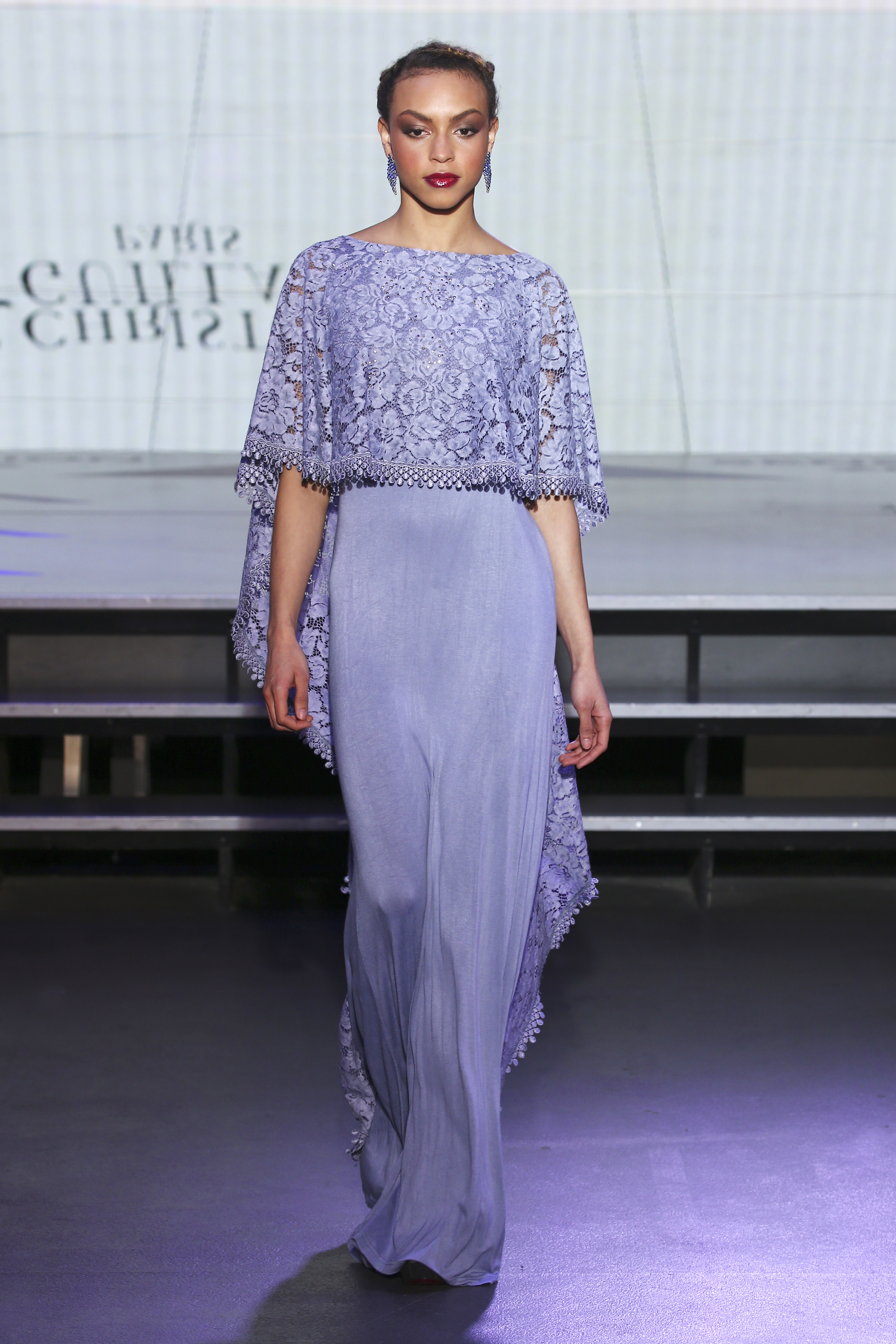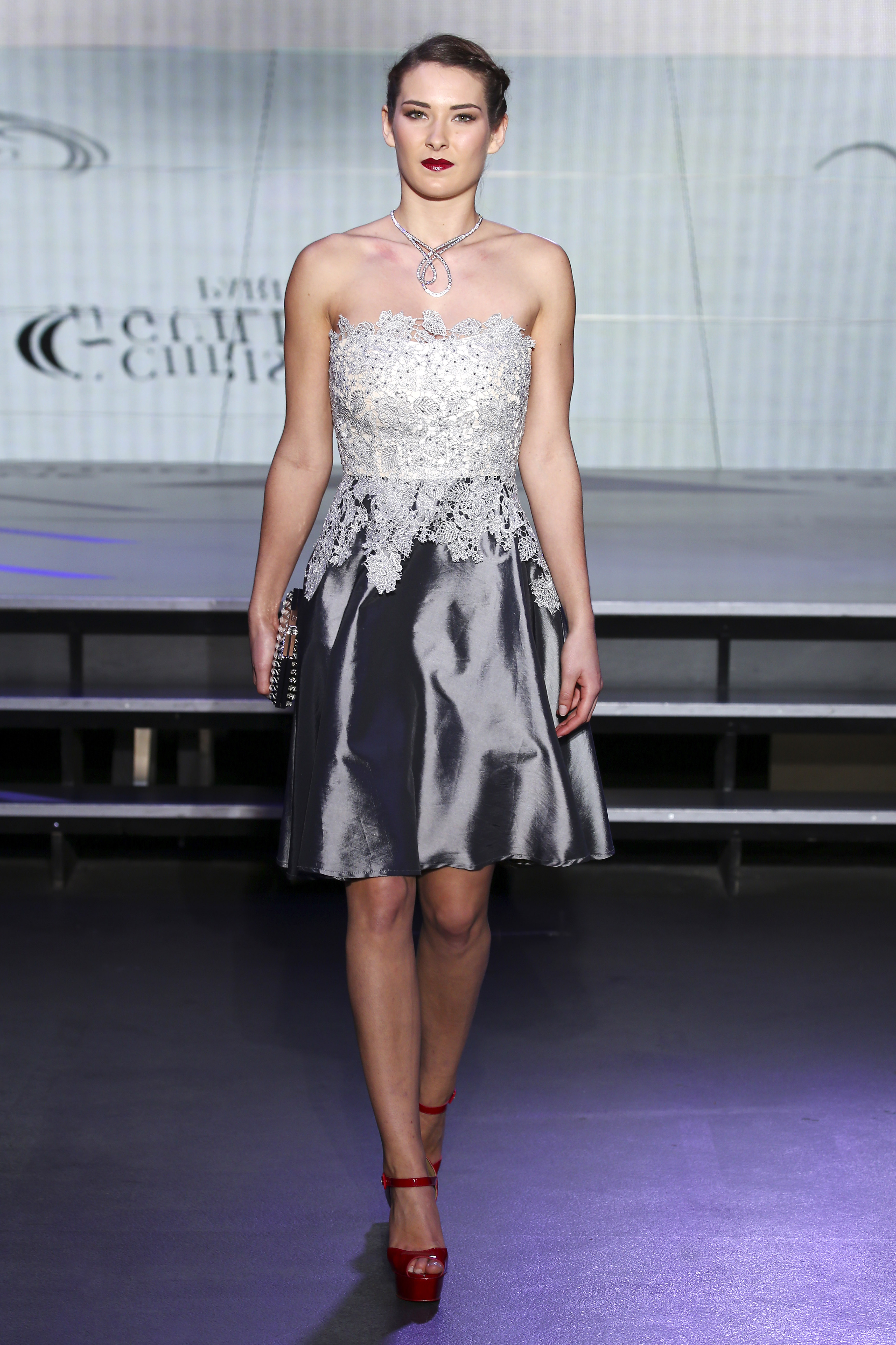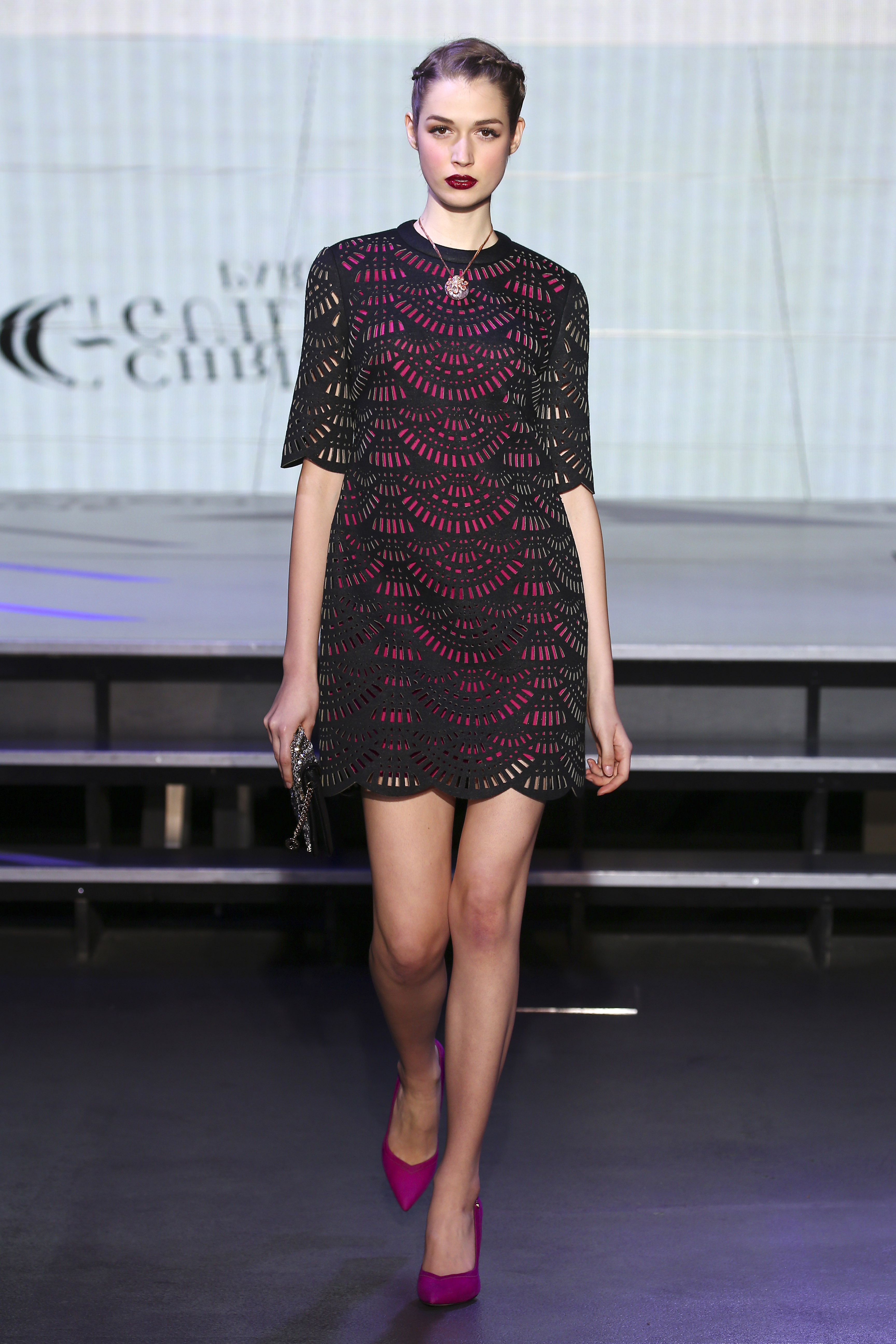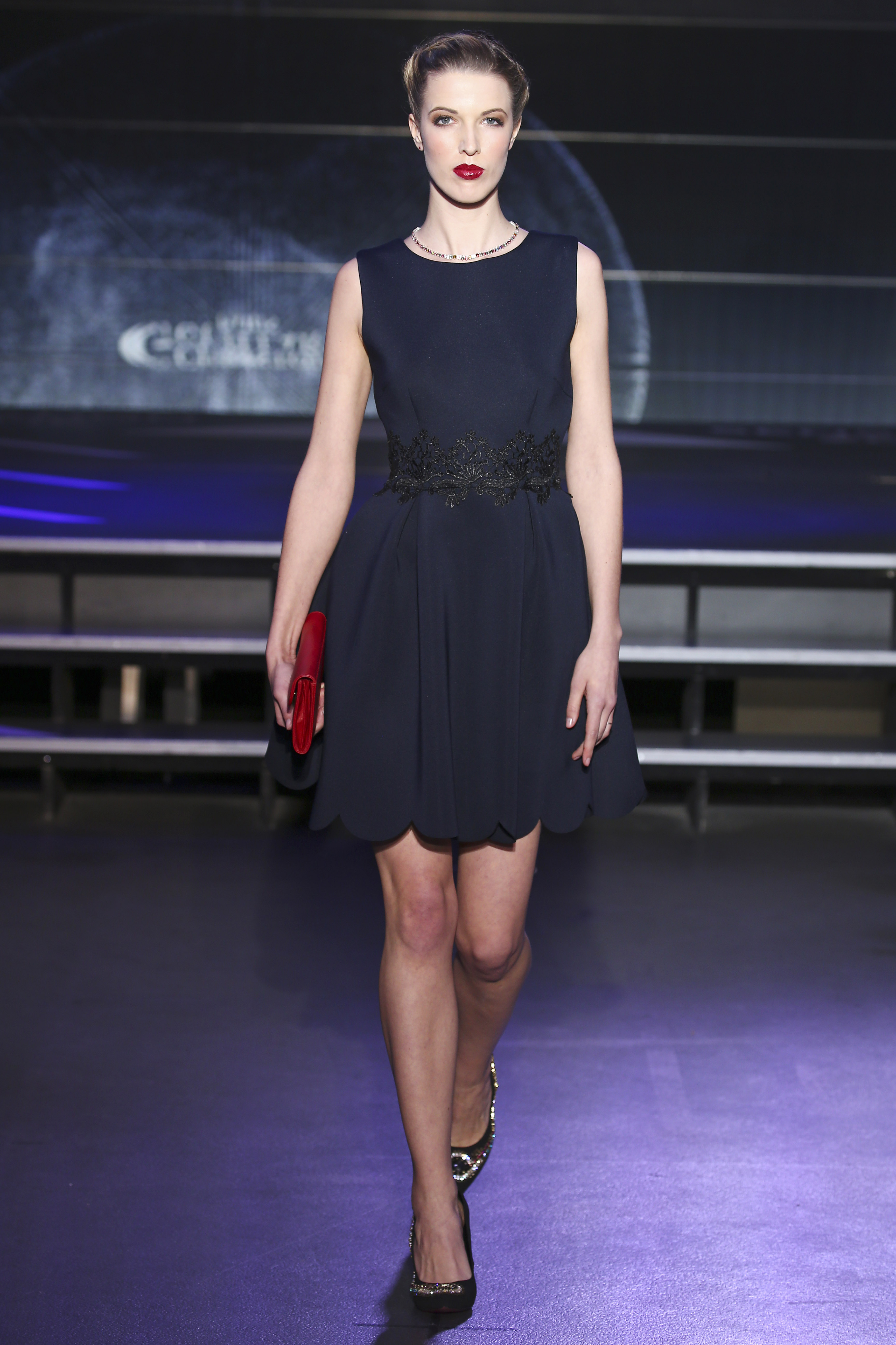 Colour range turns from pigment dyed lace in beige or amethyst, to stately ruby red, also navy blue which becames the new black, not to miss as well touches of soft pink to finalize this palette with lots of graphic accents. Versatility and unconsciousness are fused on styles in an edgy retro glam mix.