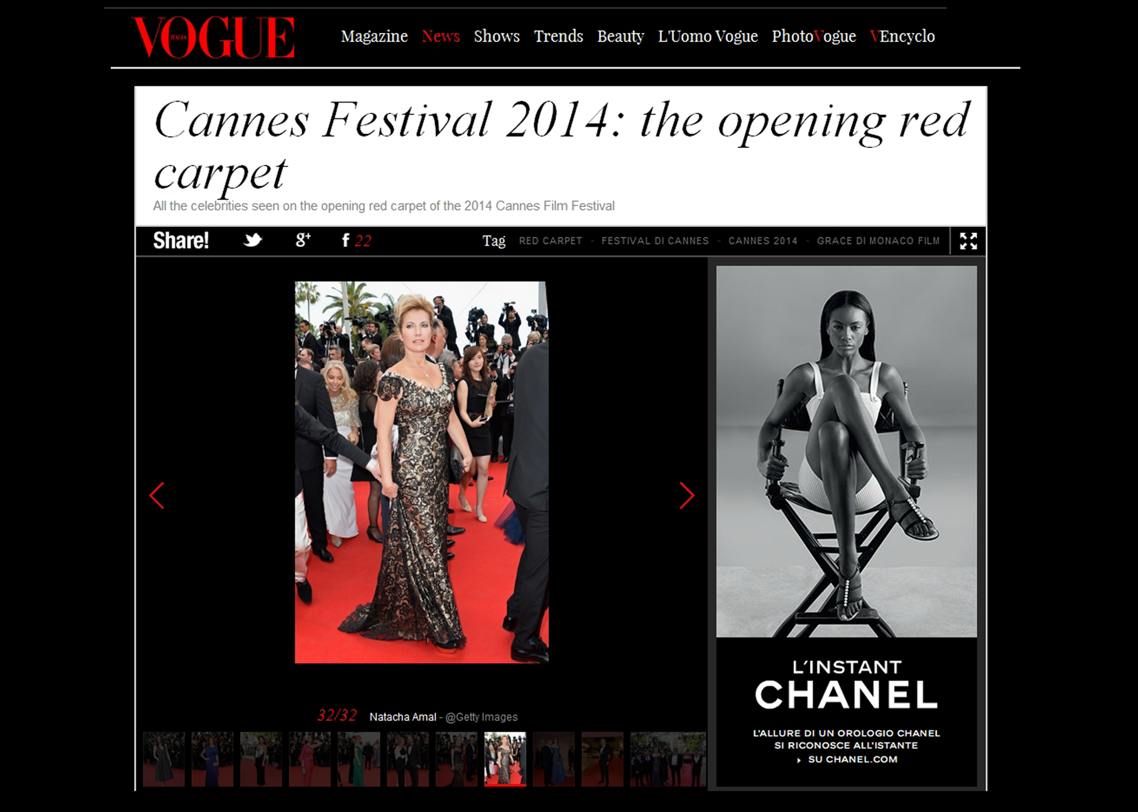 dans un fourreau en dentelle noire doublé champagne et bordé de cristal Christophe Guillarmé, pochette et escarpins Carmen Steffens, parée par Elsa Lee coiffée par Eros Giuliani et maquillée par Make Up For Ever a monté les marches à l'occasion de la projection du film Grace de Monaco