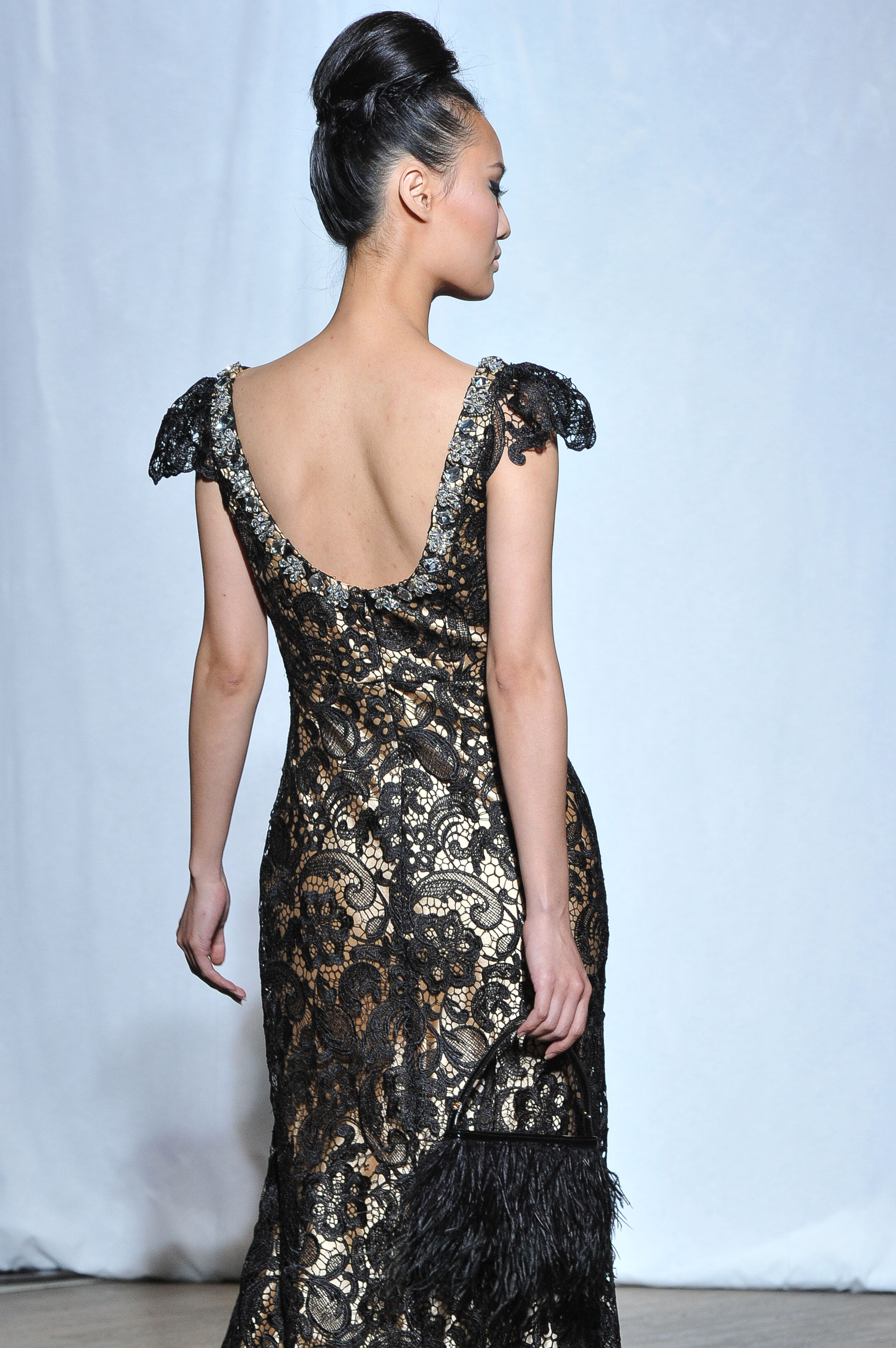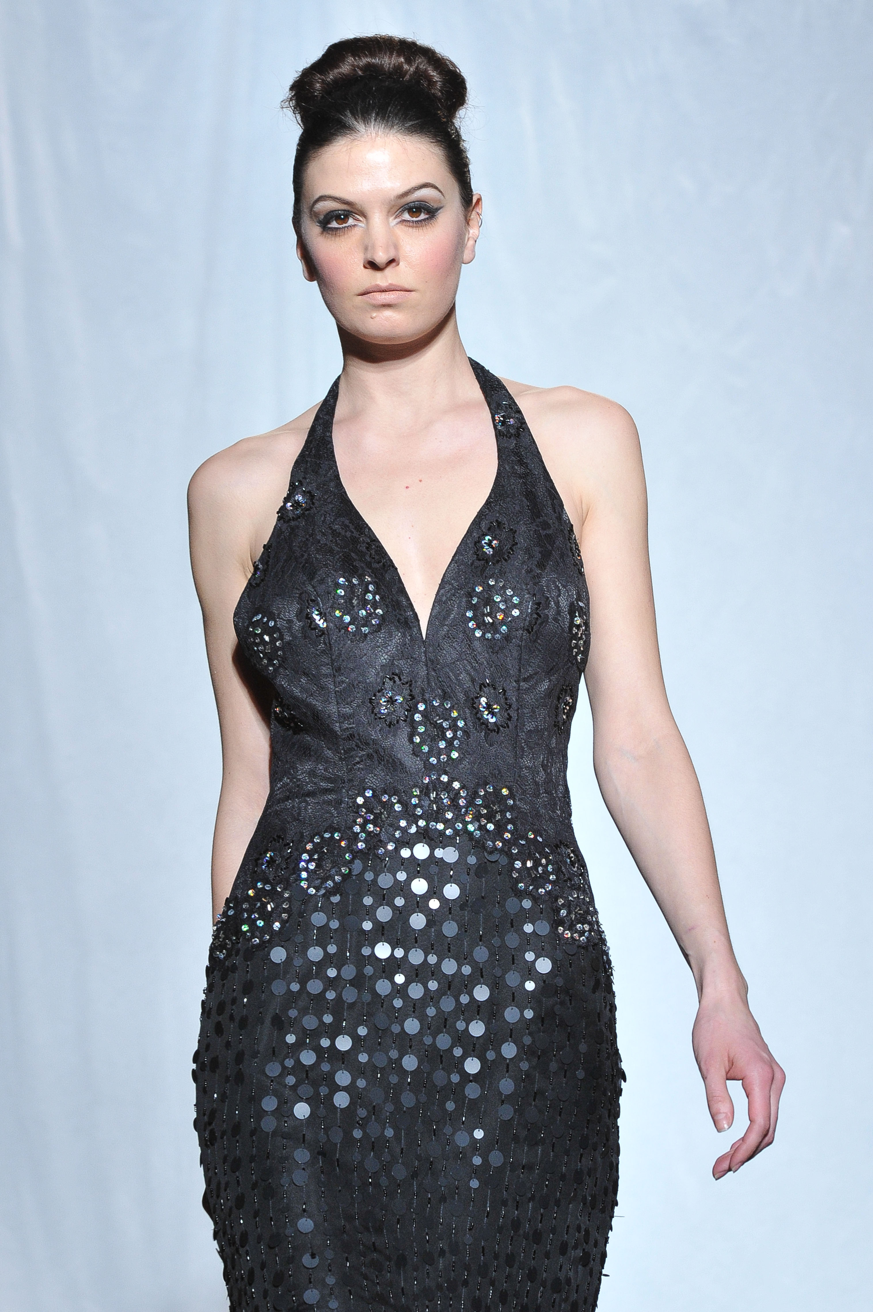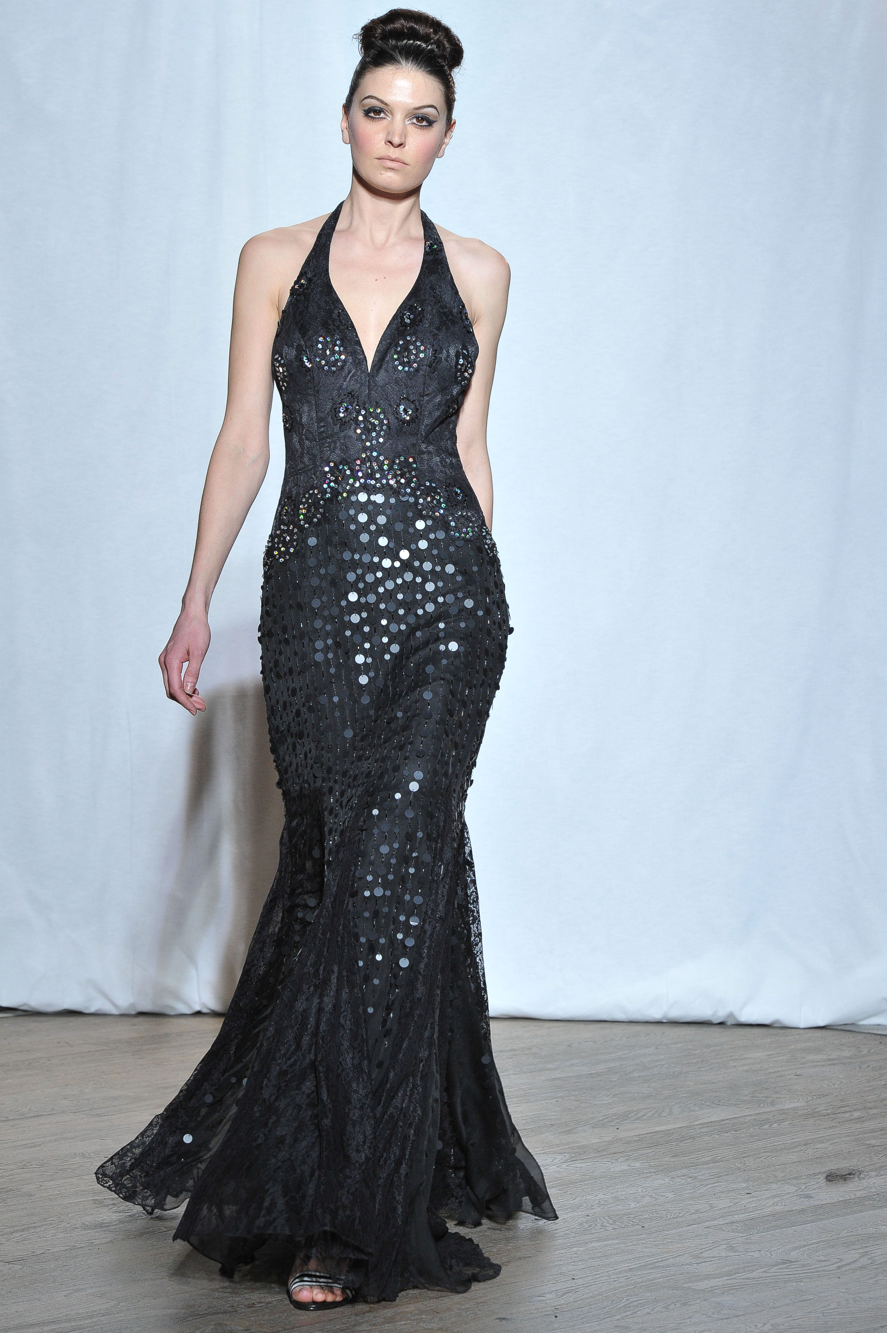 Pop touches are used in colours among fuchsia pink, turquoise blue, ruby red or purple-blue to lighten numbers of black and gold styles. Duchess satin is all over the collection mostly used in hugely spectacular dresses as much as Tulle for ethereral maxi dresses. Few ethnic beadings are reminding psychedelic Goa.
